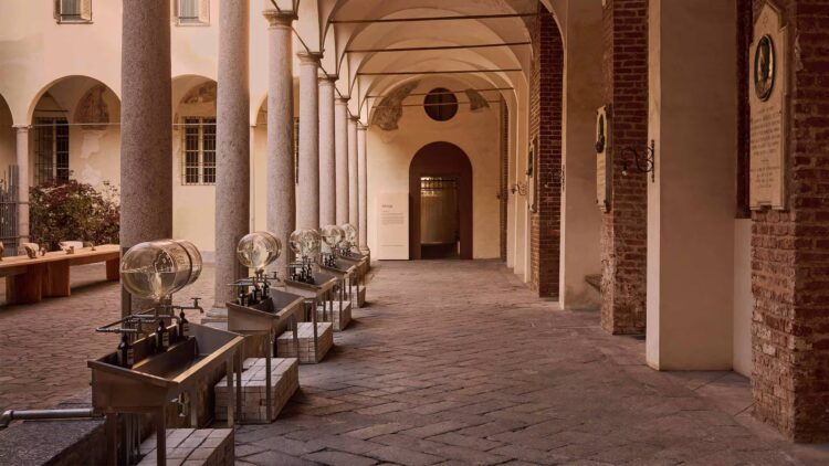 Aesop has taken over the arcades of the adjoining cloister for a cocktail party with an installation in the sacristy that is as sensory as it is elegant. The walls are covered with iridescent panels, subtly scented with Éleos. The eye is drawn to the reflections, while the scent wafts through the air, almost Imperceptibly. The space allows us to take our time, and we do. Combining ancient stones and contemporary minimalism, the venue invites visitors to experience a sense of rare, almost meditative calm. A true aromatic breath of fresh air in the heart of Brera.