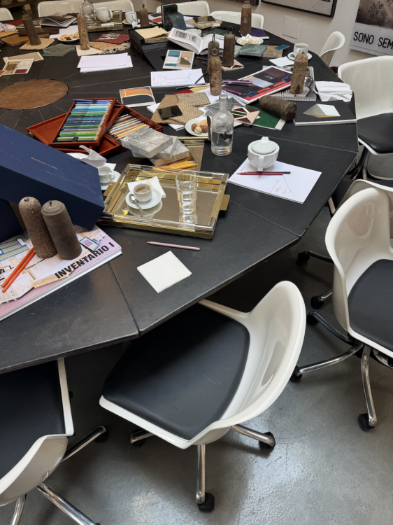 The space, set up to look like a busy office, feels like you’ve walked in on the studio mid-work. A big table covered with open notebooks, fabric samples, and coffee cups looks like someone just left a work session. On the walls, an accumulation of photographs, sketches, and textures blend together to form a gigantic mood board, a true reflection of the studio’s universe. The past emerges, the present is invented. It’s a way for Dimore to blur the lines between fiction and reality, while remaining true to their unique, elegant, romantic, and always slightly mysterious universe.