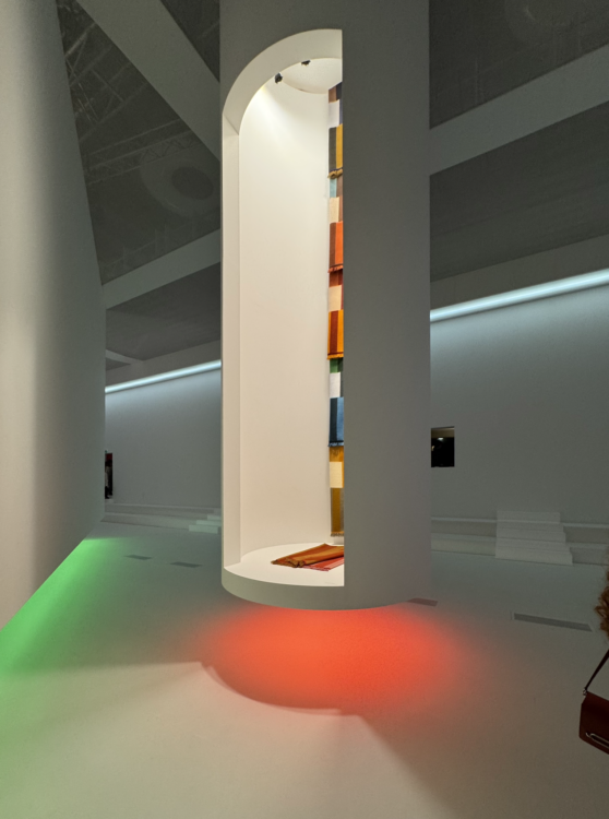 At La Pelota, a legendary venue for Milanese design, Hermès has taken the opposite approach to spectacle. There is no grandiose staging here, just a captivating, almost weightless simplicity. In a virtually empty space bathed in colored halos, volumes float weightlessly, each object seeming isolated in its own bubble, enveloped in silence and light.