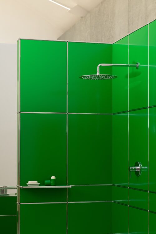 Also at Capsule Plaza, we found a space that resembles a tranquil laboratory. Here, Humanrace, the wellness brand founded by Pharrell Williams, has collaborated with USM Modular Furniture to reimagine the bathroom. Breaking with convention, the installation offers a new way of thinking about this space dedicated to our daily care routine.