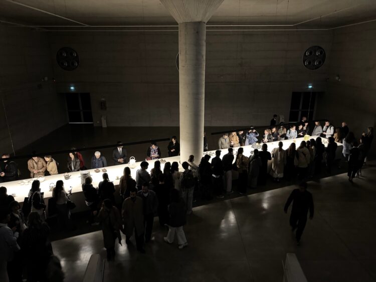 Glass is at the heart of the installation: crafted with precision and finesse, it plays with light to reveal what is usually invisible. At the center of the room, Tomás Alonso’s Pivot table catches the eye with its clean lines and subtle yet structuring colors. Surrounding it, Nigel Peake’s delicately watercolored porcelain pieces and sumptuous textiles unfold a delicate narrative, full of rare gestures and precious craftsmanship. Everything is suspended, nothing is fixed. The scenography is precise, refined, yet deeply alive.