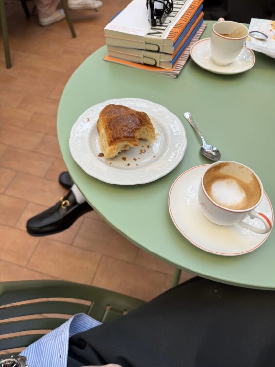 Then we head to the sidewalk café with a coffee and cornetto in hand to enjoy a quick break before continuing our exploration of Milan’s showrooms.