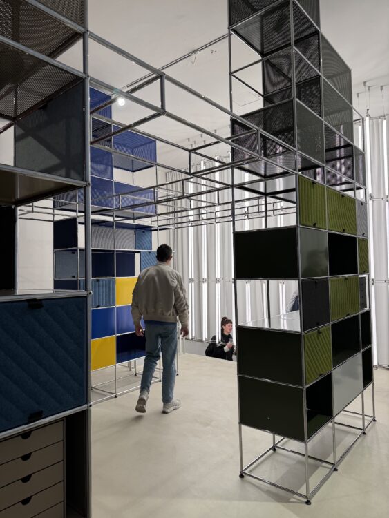 We begin our journey at Spotti, where the USM installation immediately immerses us in a soft, modular atmosphere. USM is celebrating the 60th anniversary of its famous Haller system, and to mark the occasion, the Swiss brand is unveiling a new textile add-on: the Soft Panel. This small element simply clips into place and transforms the look and feel of the furniture in the blink of an eye. The panels are soft to the touch, colorful, and above all modular—a real success both aesthetically and acoustically.