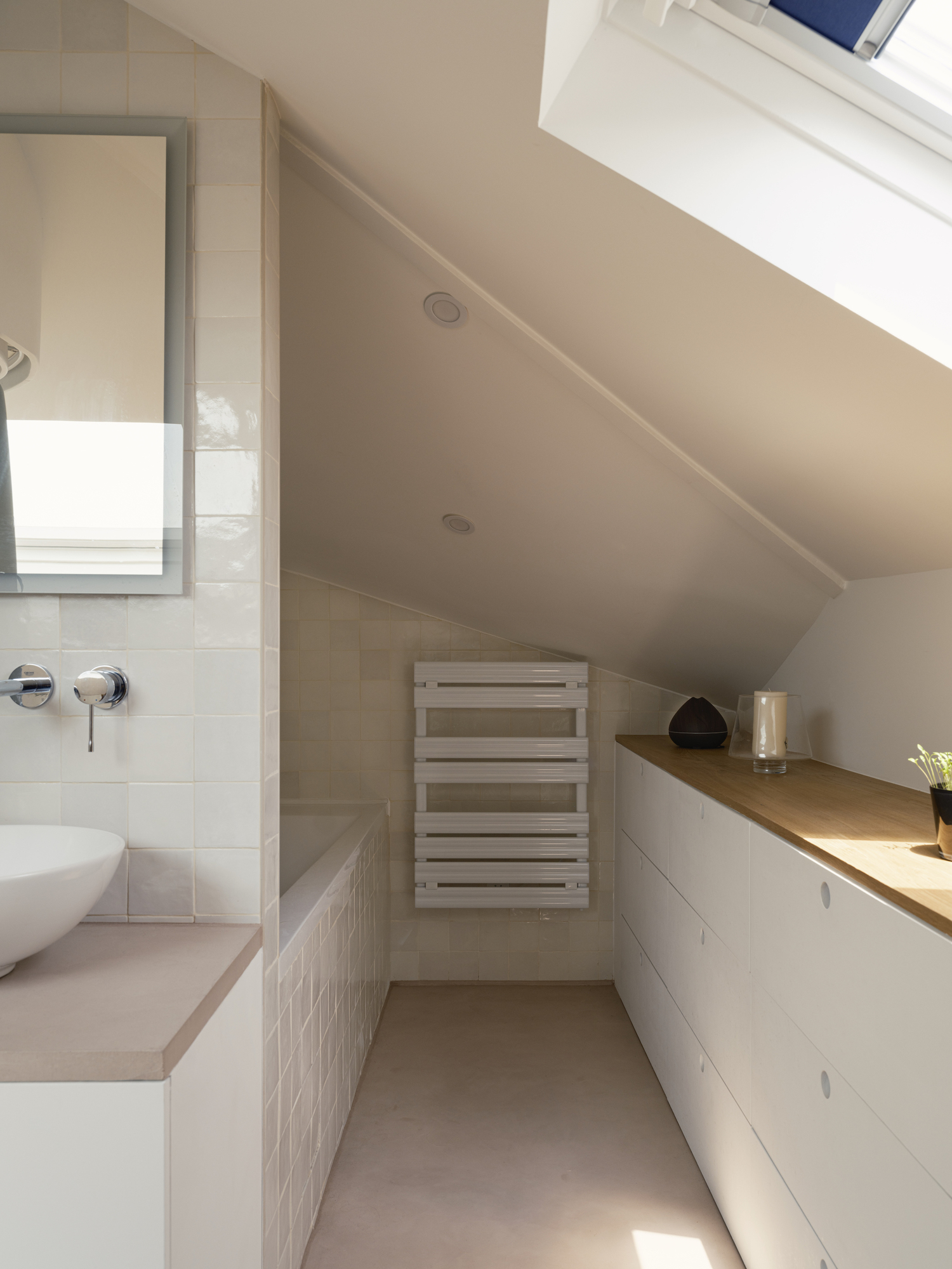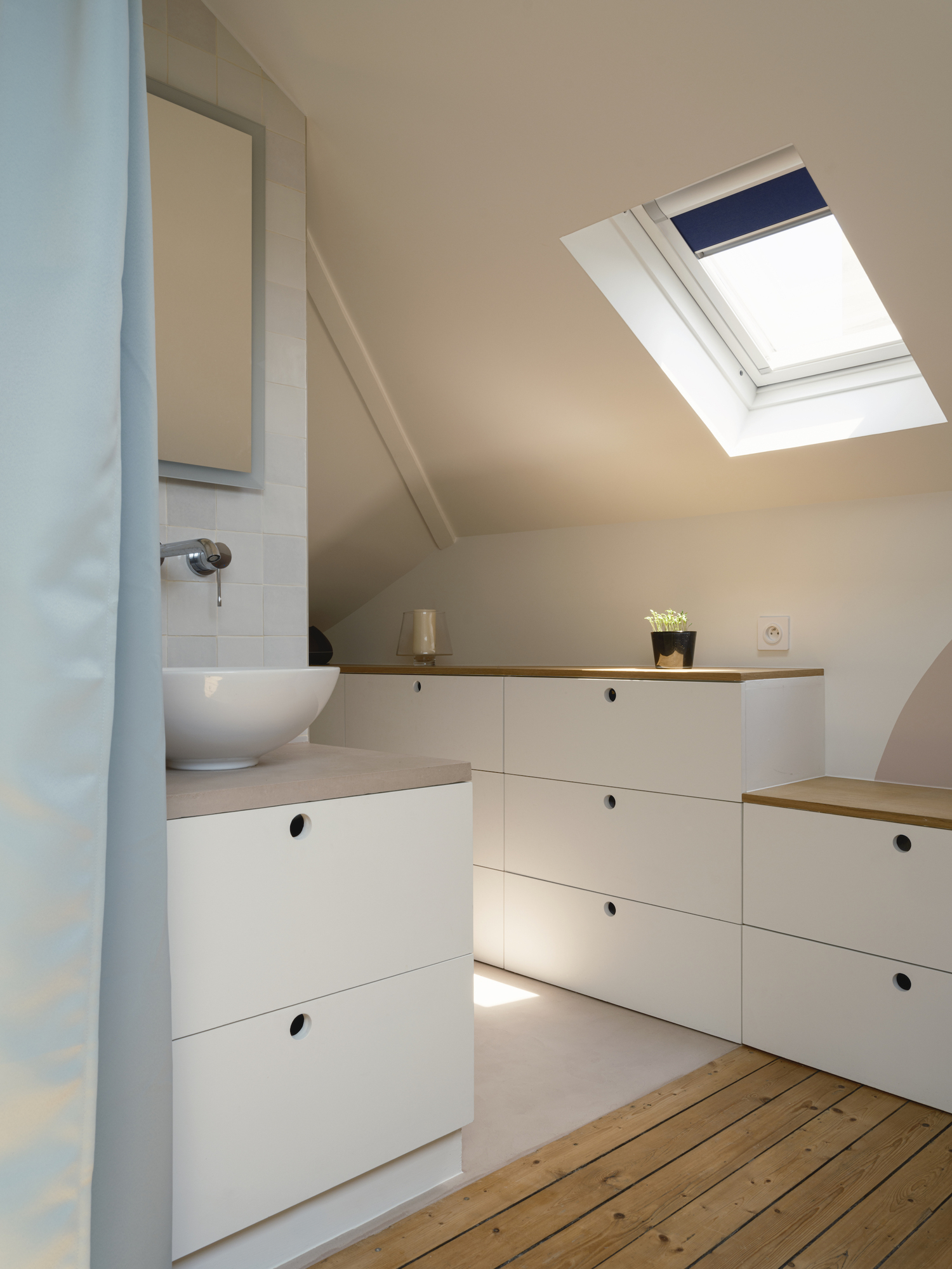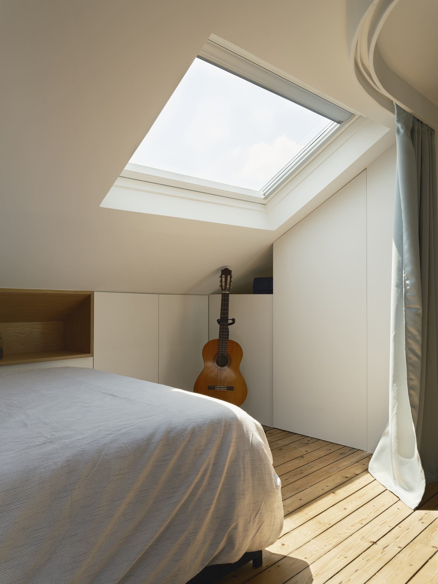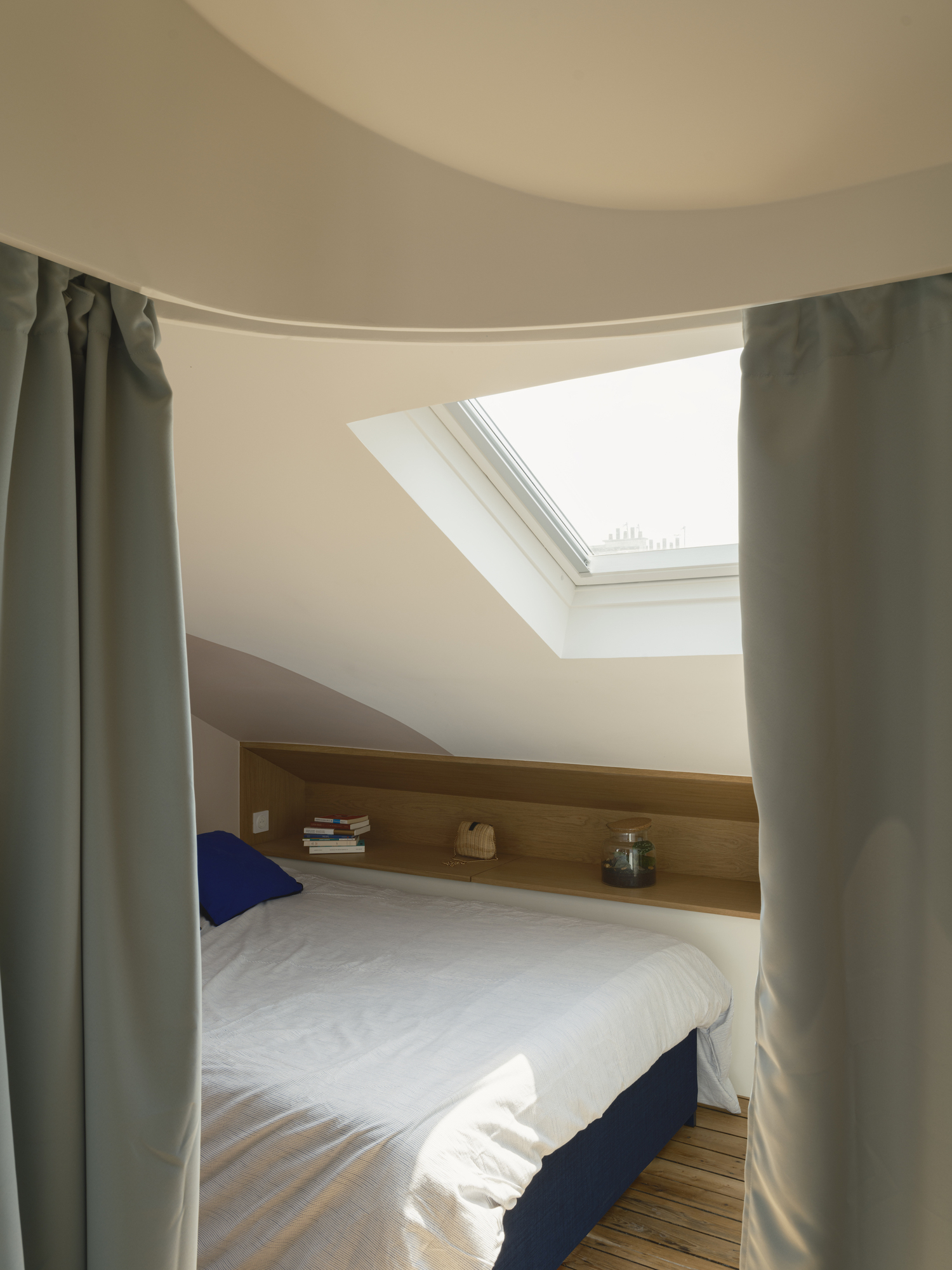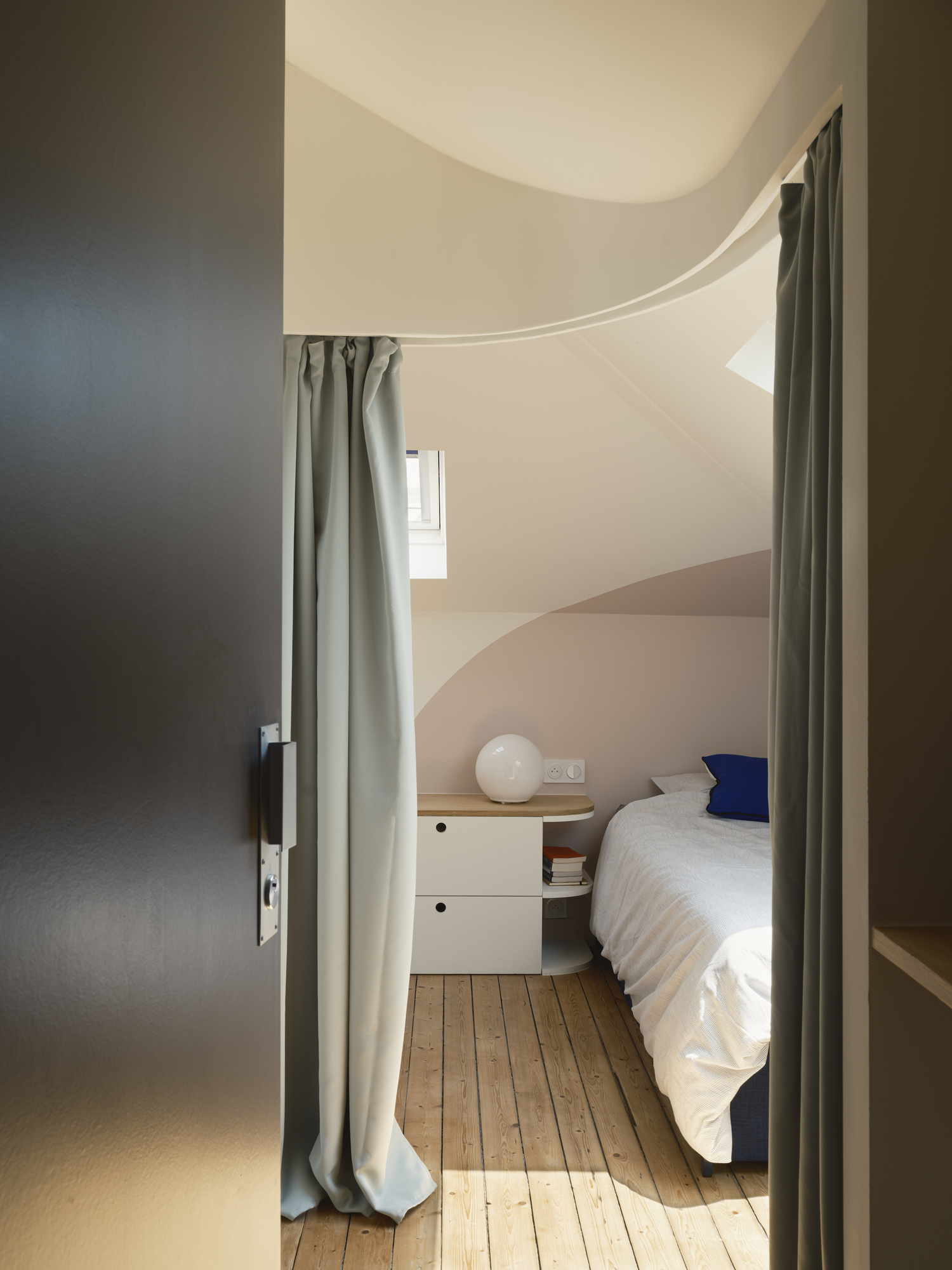 The apartment opens onto the sleeping area, which nestles in the sloping ceiling.