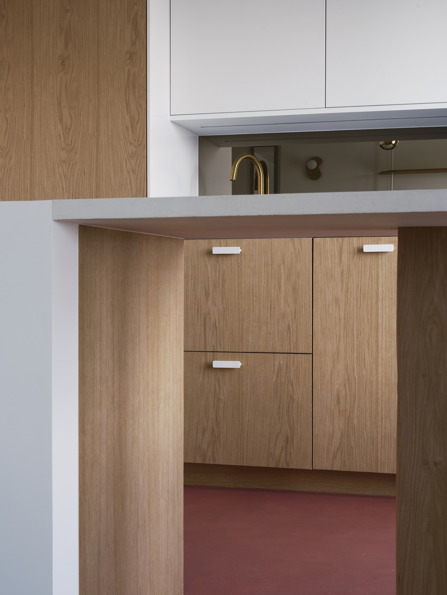 On the floor, terracotta-colored waxed concrete defines the kitchen area.