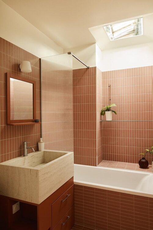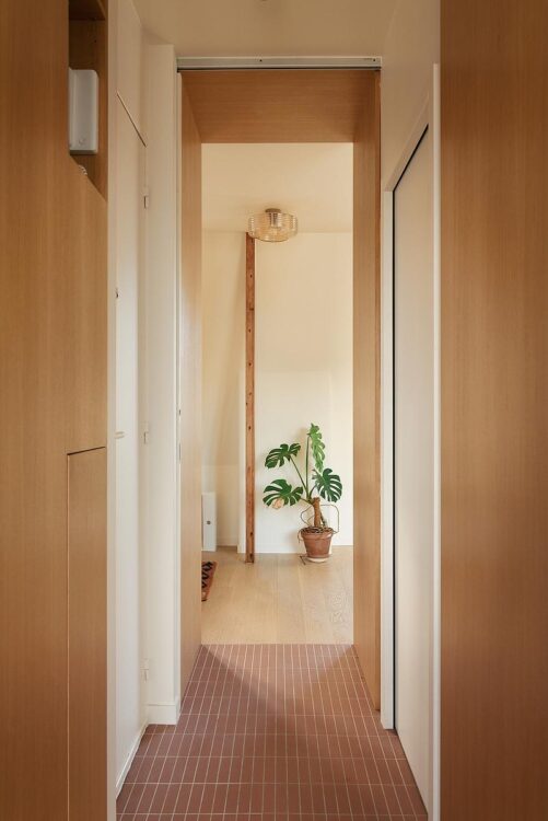 The entrance corridor sets the tone for the project: terracotta tiles by Wow Design mark the floor and naturally guide footsteps around the central volume that houses the bathroom. This simple design immediately restores legibility to a previously fragmented floor plan.