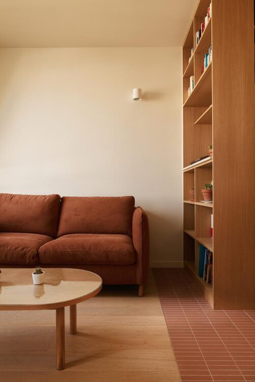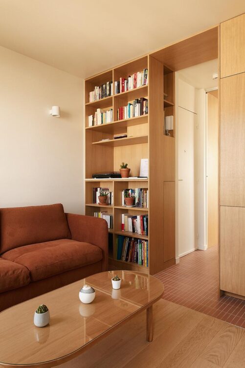Here, the built-in elements do more than simply dress up the space. At the crossroads between furniture and architecture, the oak bookcase softly structures the room while multiplying storage space. Parquet from Decoplus, Stan spotlight from Faro.