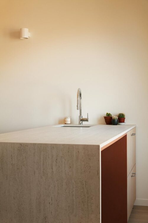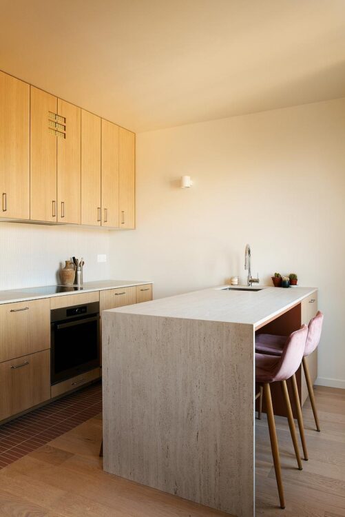 Extending from the living room, the open-plan kitchen with its sober storage units follows the same logic of fluidity. The result is a coherent, convivial living space that looks outwards.