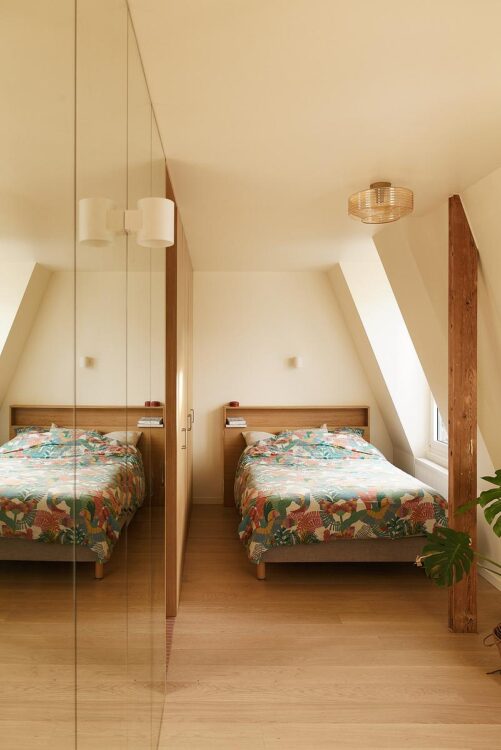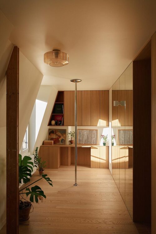 On the courtyard side, a modular workspace takes advantage of a more intimate volume that hugs the slopes of the roof. Thanks to a pole dance bar and XXL mirror, the room can be transformed into a dance studio.