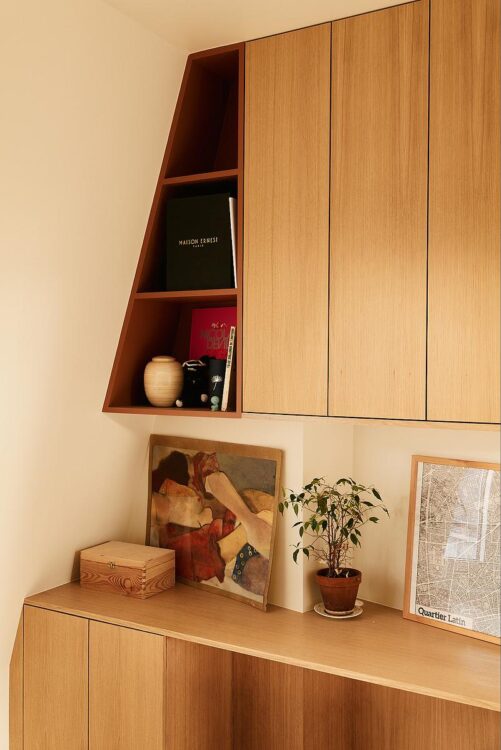 On the top floor of a building on Boulevard Saint-Germain, this 37-square-meter apartment has been redesigned around a central volume that redistributes spaces, streamlines circulation and reveals an unobstructed view of the Parisian rooftops and Notre-Dame.