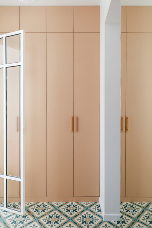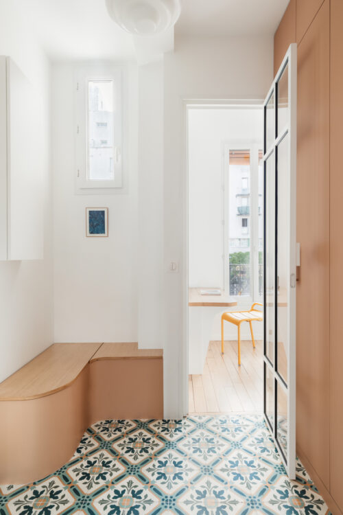 Bathed in light, the entrance hall features a custom-made bench and a pink-hued cupboard.