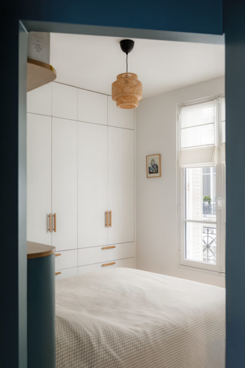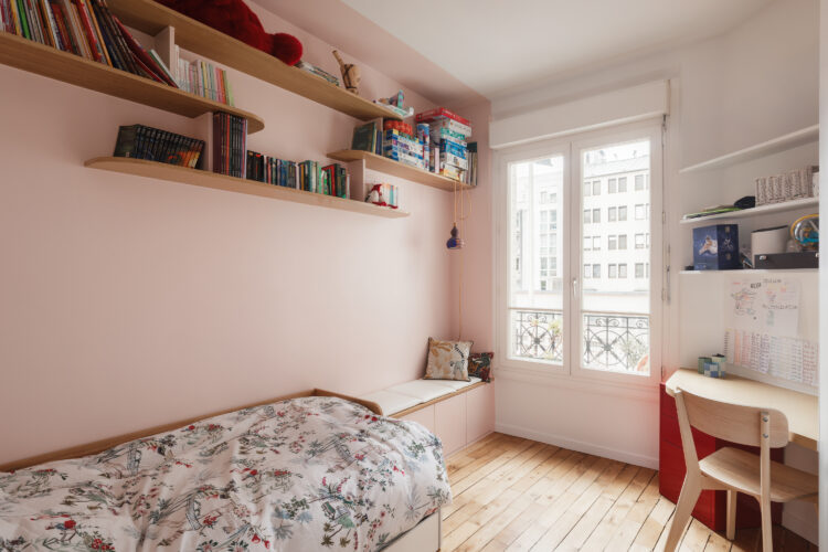 The first bedroom is organized around white woodwork that structures the space. The pink wall creates a soft depth, punctuated by shelves laden with childhood treasures. The honey-colored parquet flooring adds warmth to the whole room.
