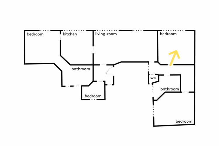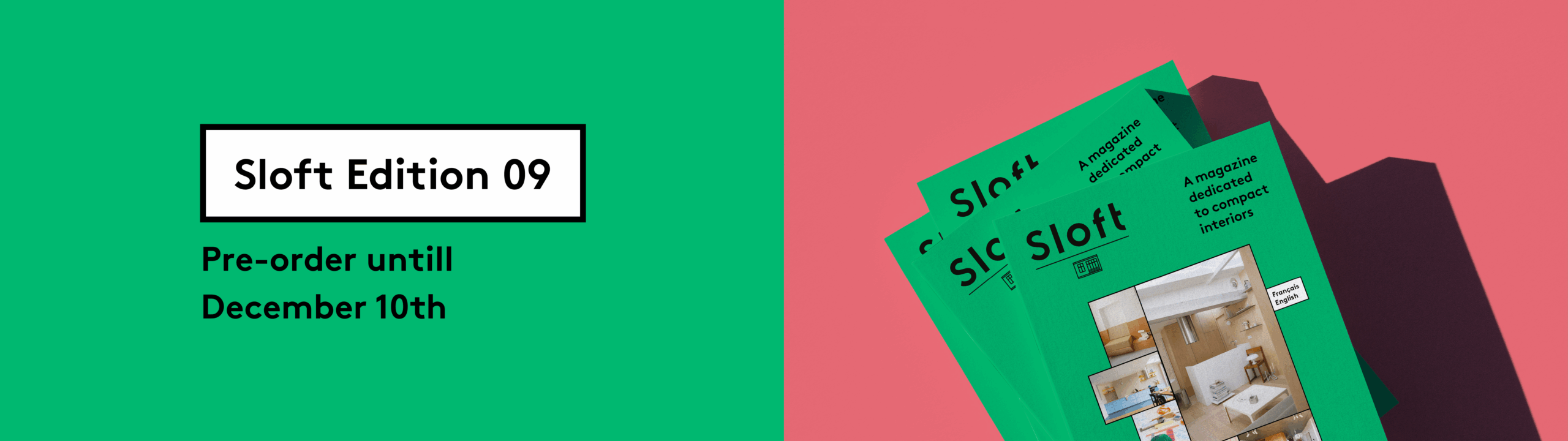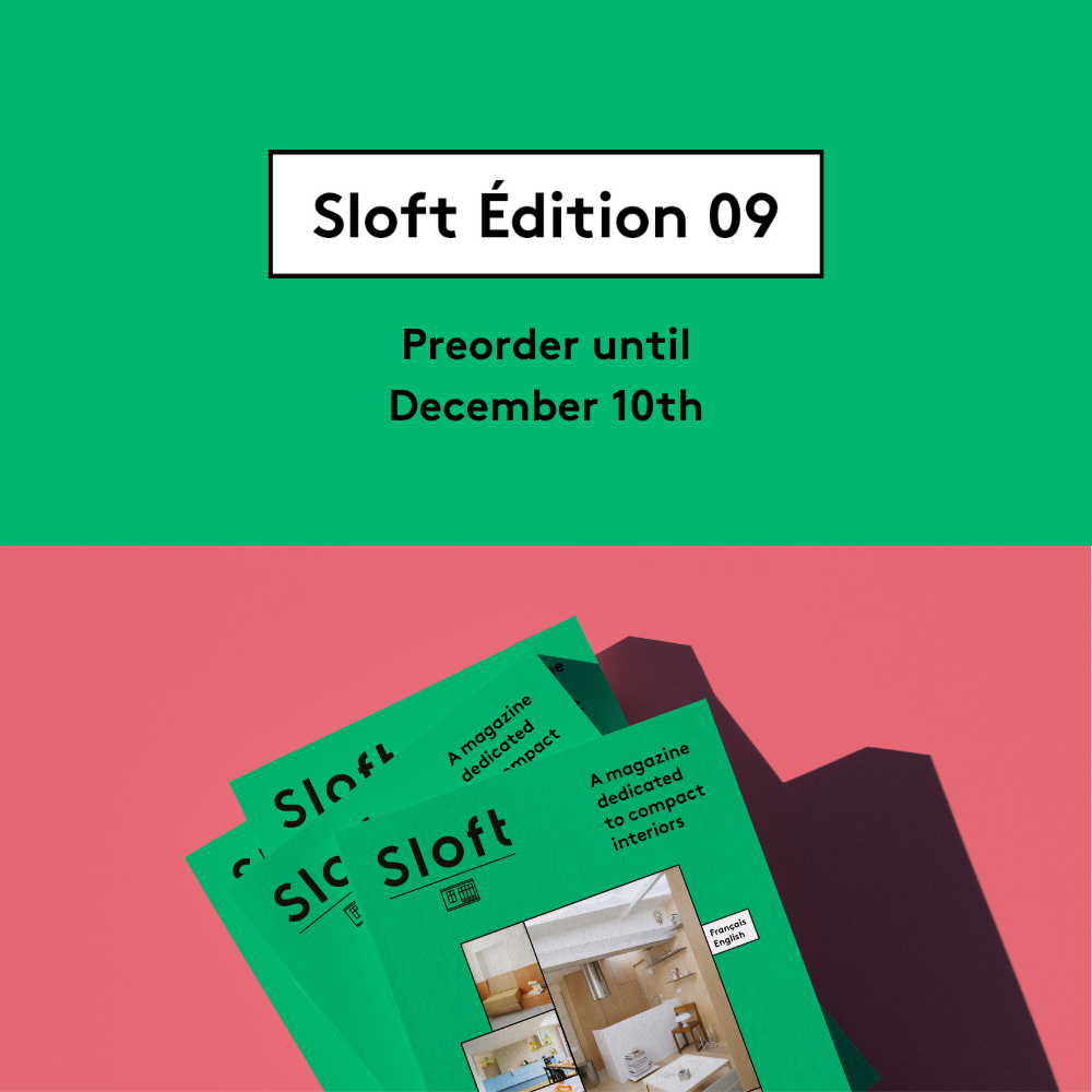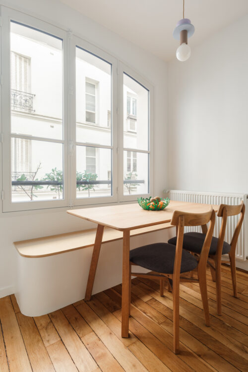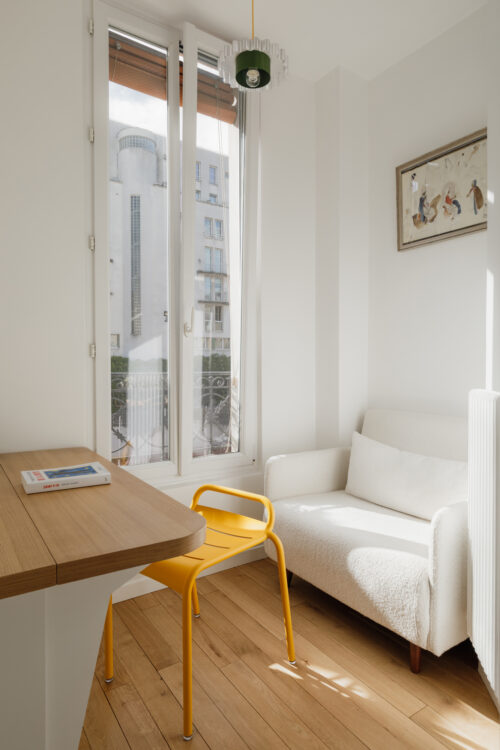 Opening onto the courtyard, the room enjoys beautiful natural light. The wooden platform stretches out beneath the window and dialogues with the sofa bed.