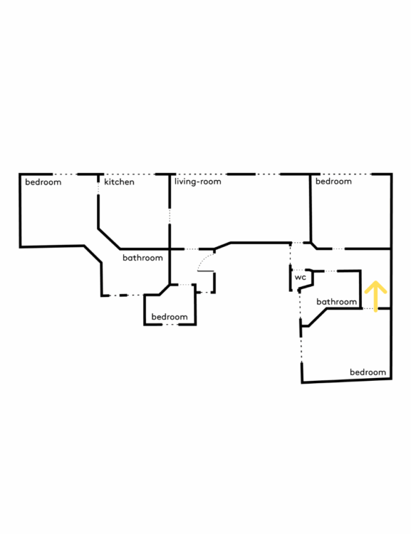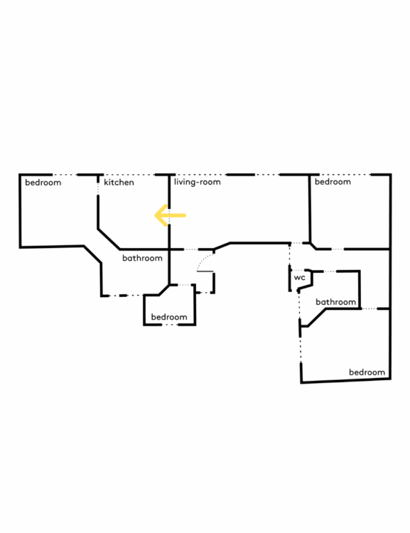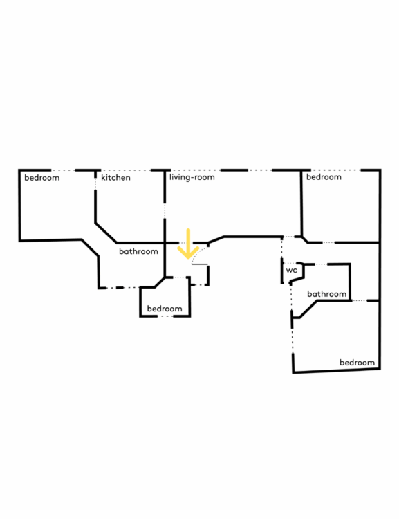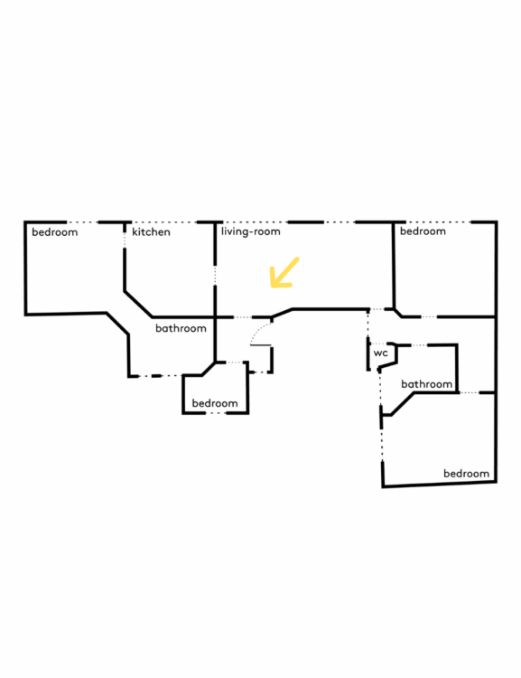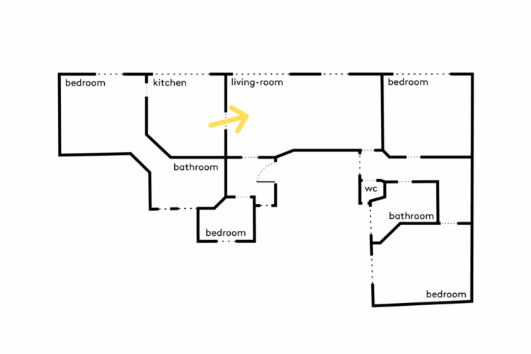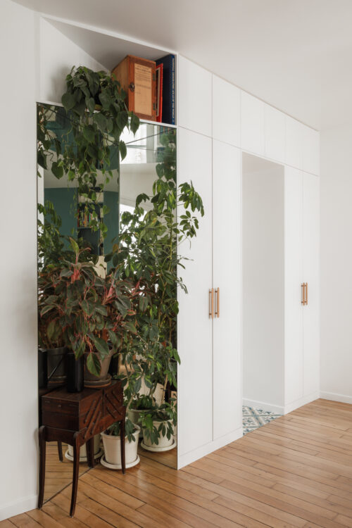 An archway marks the transition between the entrance and the living room. Its white facades conceal storage space and incorporate a mirrored niche where the family’s plants flourish.