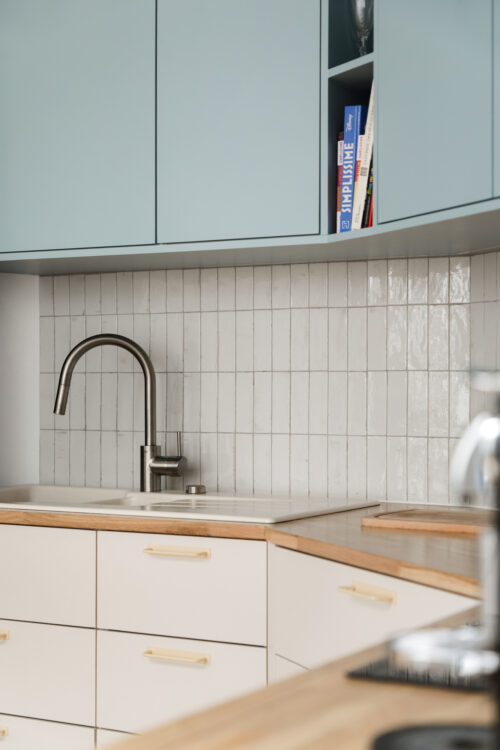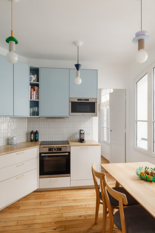 Accessible from the living room, the kitchen is decorated in light colors. The pale blue cabinet fronts complement the wood countertops and original hardwood floors.