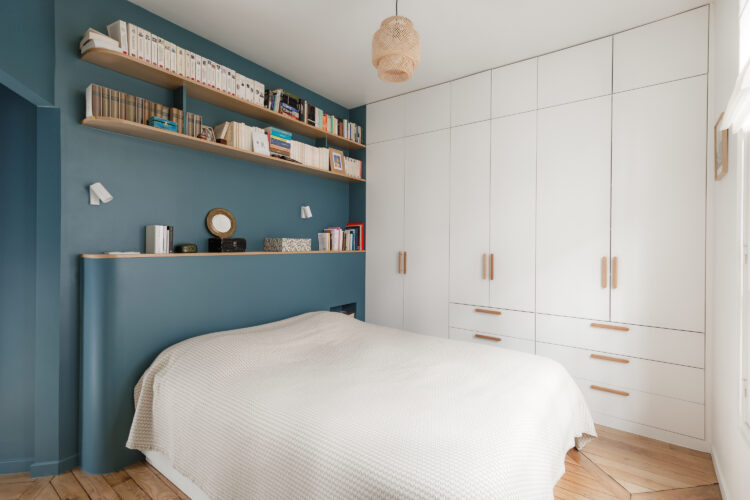 Extending the color palette of the living room, the bedroom features a deep blue that highlights the custom-made furniture’s curved lines.