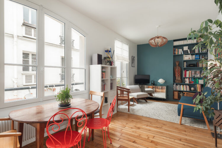 Overlooked by the large window, the dining room is centered around a wooden table surrounded by mismatched chairs. The adjacent living room is organized around a large, deep blue bookcase. The sofa and armchairs, with their simple lines, create a welcoming space bathed in light.