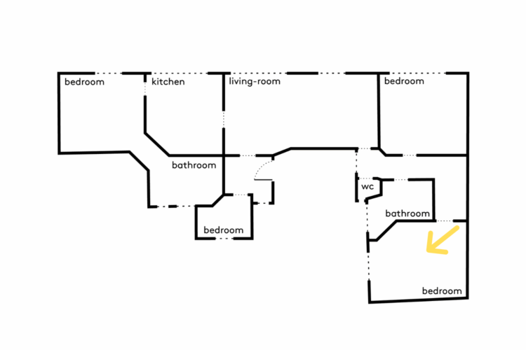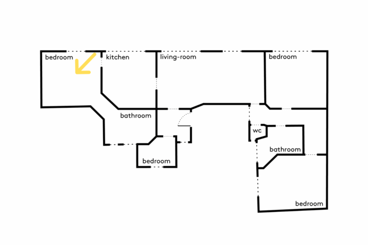 The cupboard unit interacts with the floor pattern and naturally guides the eye toward the adjoining guest room/office space.