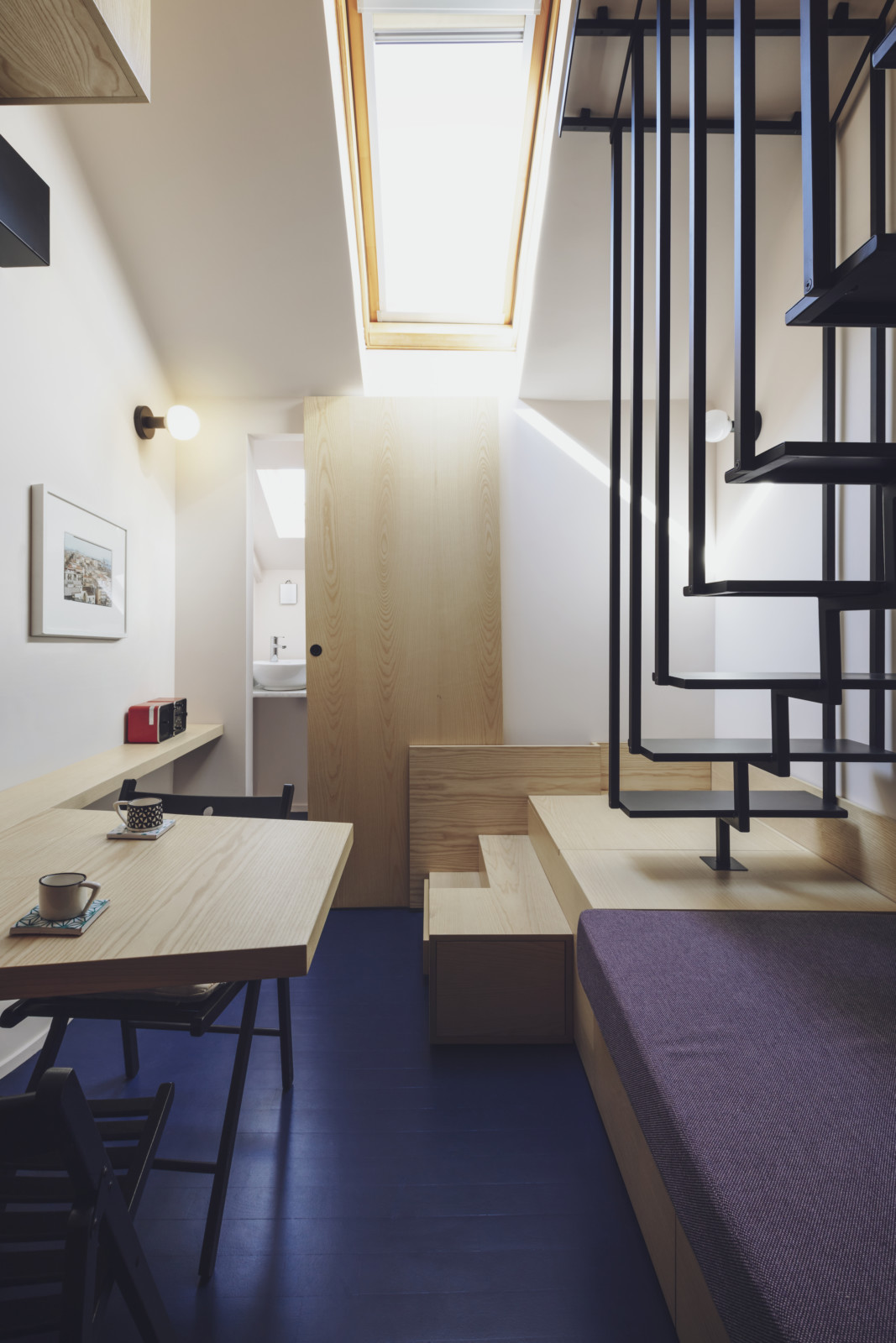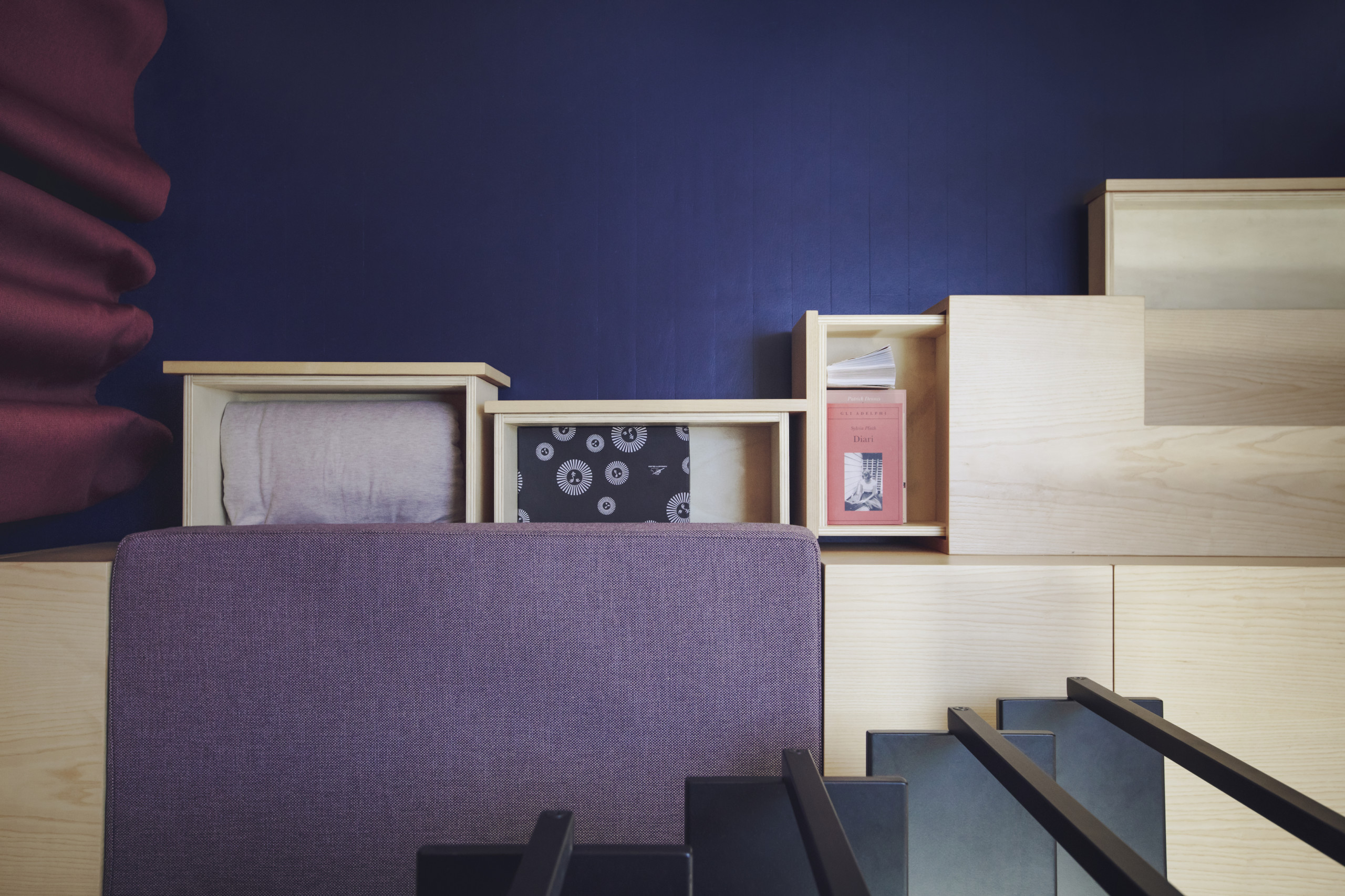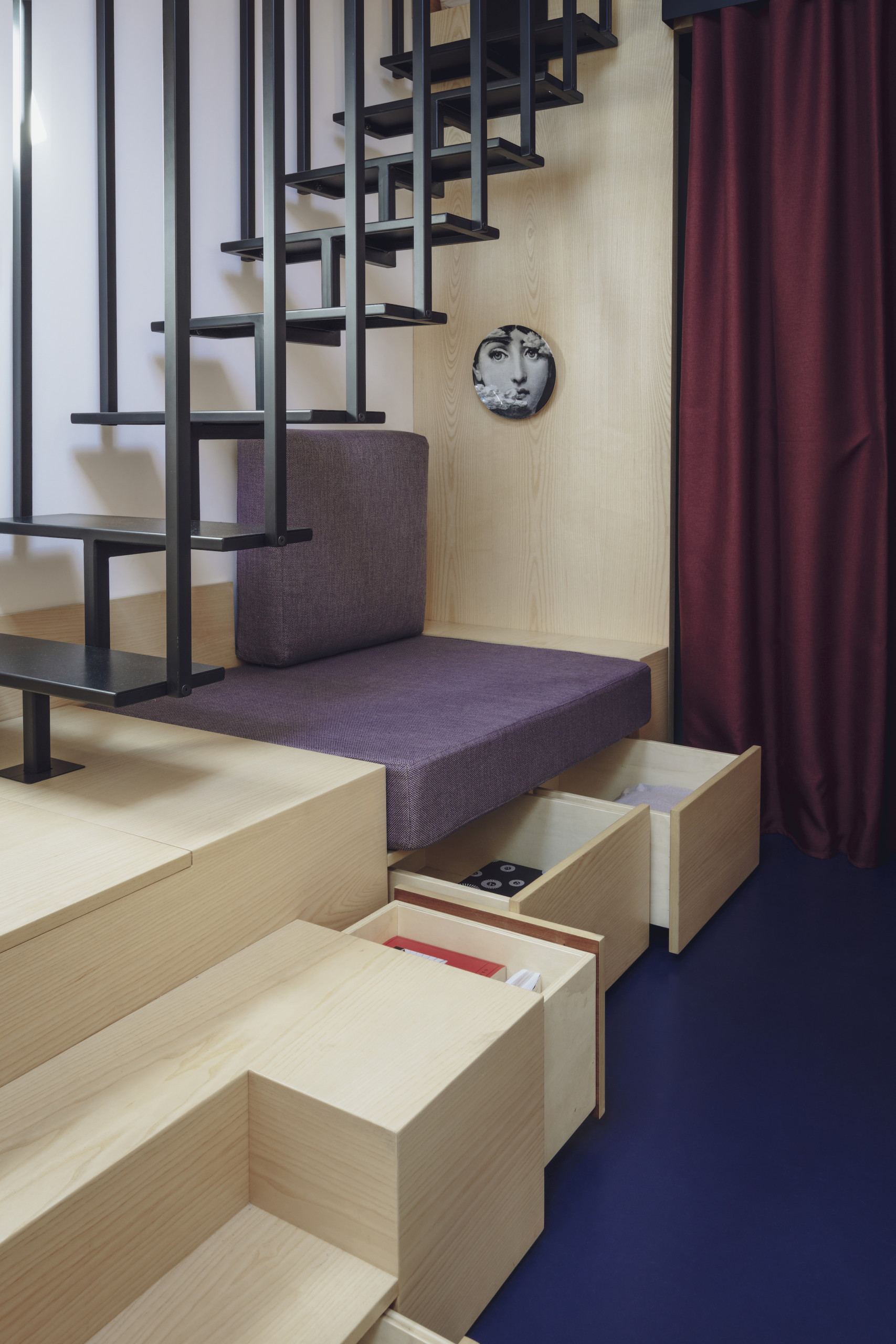Close-up of the apartment’s dominant colors. The deep blue floor matches with the curtain and bench seat. The black of the staircase perfects the elegant, sophisticated atmosphere of the studio, softened by the clarity of the wood and white walls.