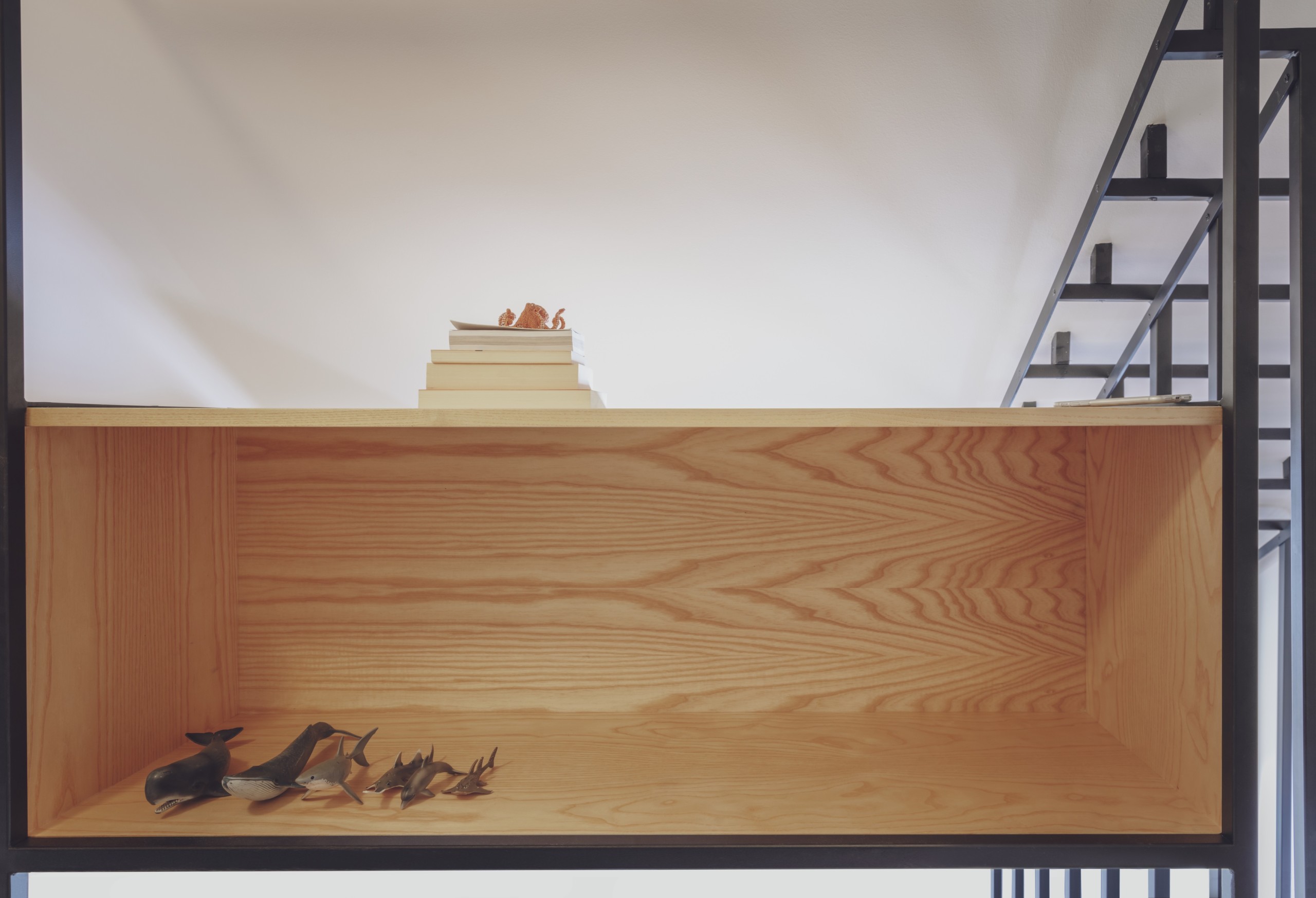 The volume has been arranged using a custom-made plywood envelope that modulates the space according to need.