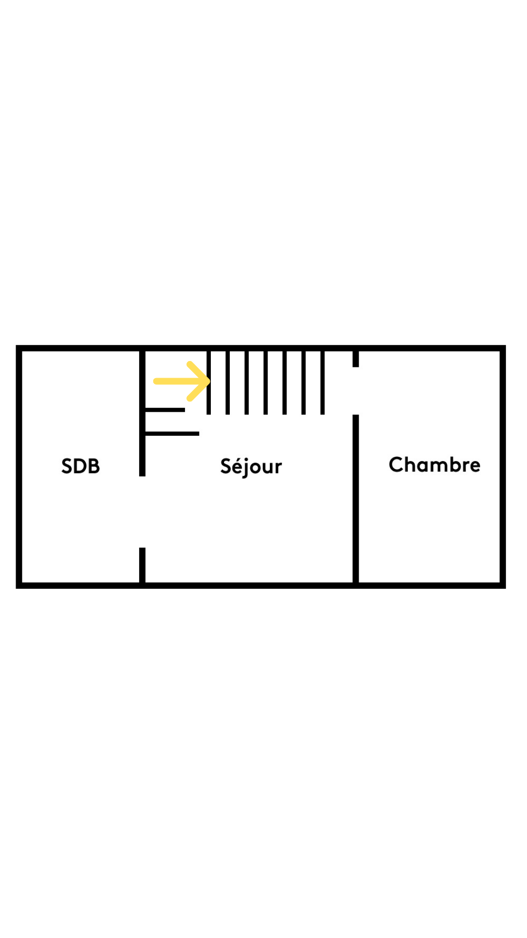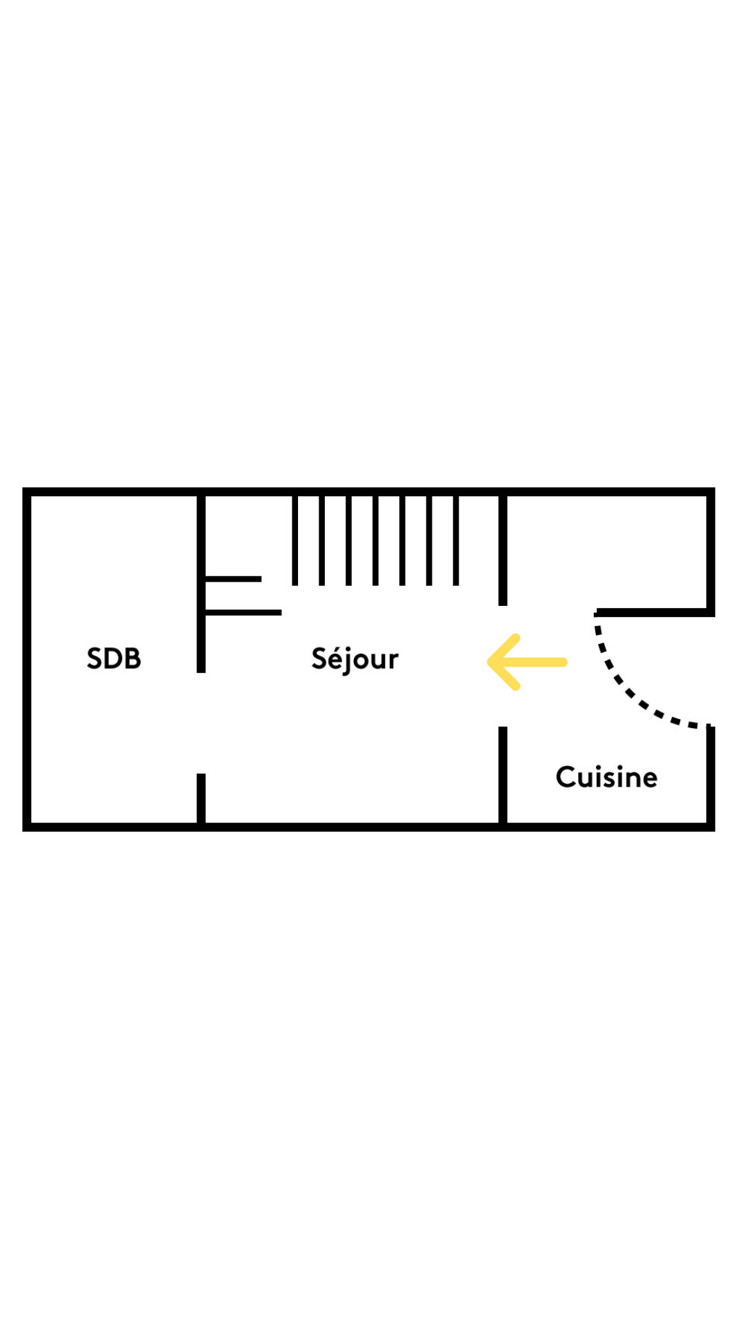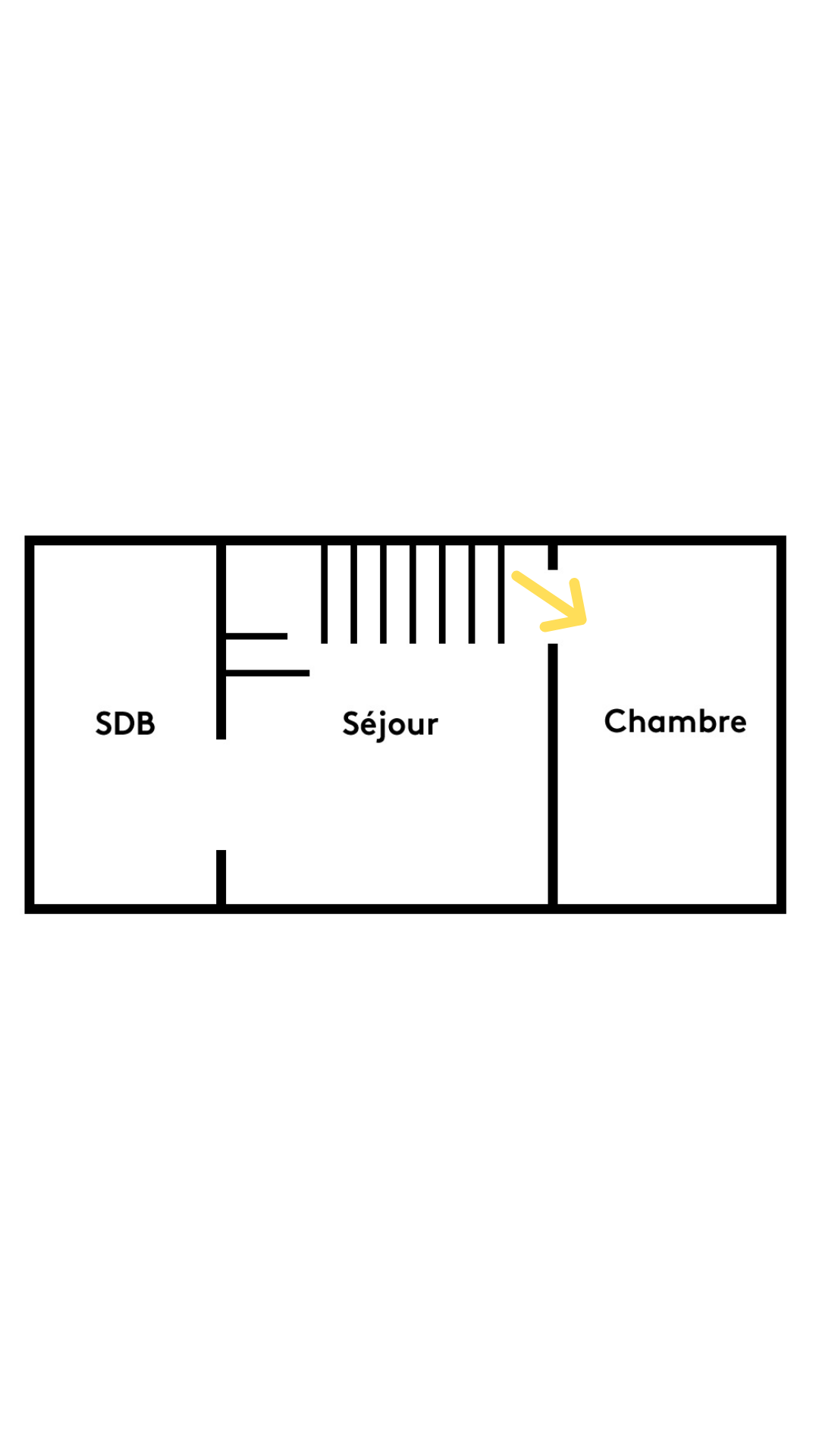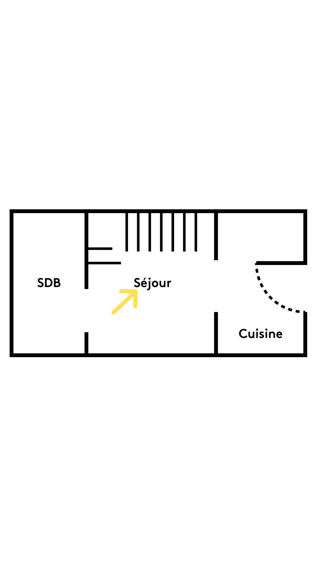 View from the staircase. On the right, the bathroom door slides open without obstructing movement. Under the staircase, the first steps also become drawers.