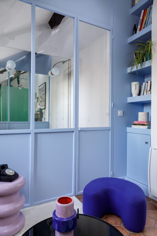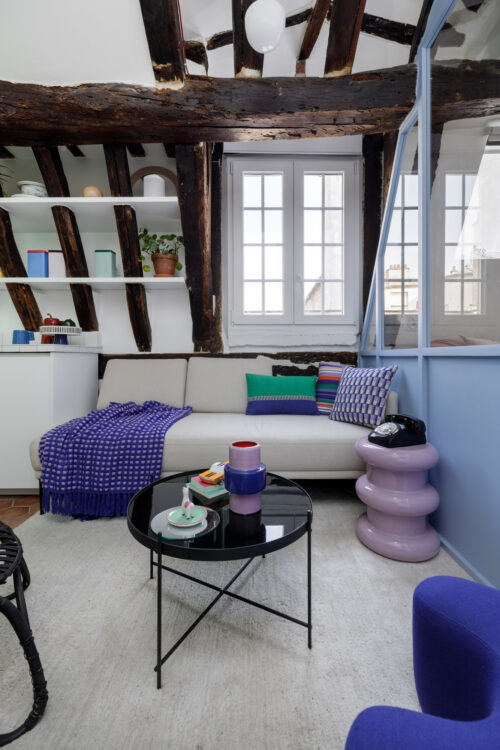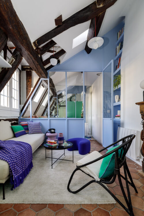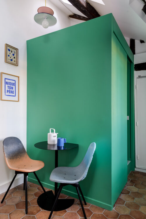 These 22 m² have been passed from the hands of one artist to those of another. Fascinated by color, Ekhi Busquet uses it to structure the space of her “shoebox”. The use of bold hues contrasts beautifully with the exposed beams and original floor tiles that have been preserved.