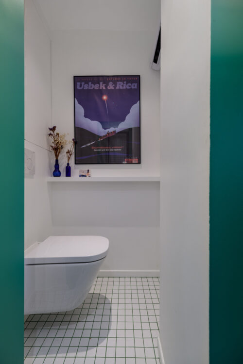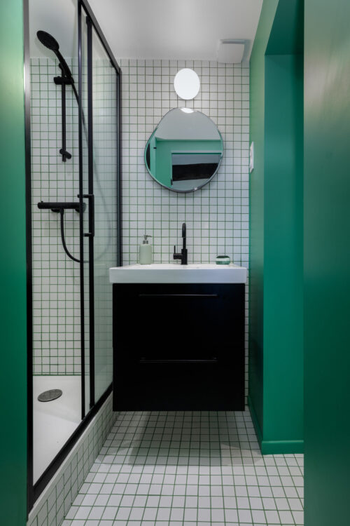 … La salle d’eau ! Compacte et fonctionnelle, celle-ci est particulièrement graphique avec sa robinetterie noire, sa faïence et ses joints teintés, véritable signature des pièces humides de l’appartement. La forme organique du miroir The Cool Republic tranche avec le caractère très géométrique de cette pièce.