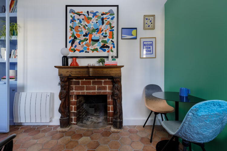 A painting by Matthieu Vergote sits above the brick and carved wood fireplace. Its square shape matches that of the hearth, while its colors seem a natural match for the hues chosen by Ekhi Busquet. The Gravêne chairs are from Maximum.