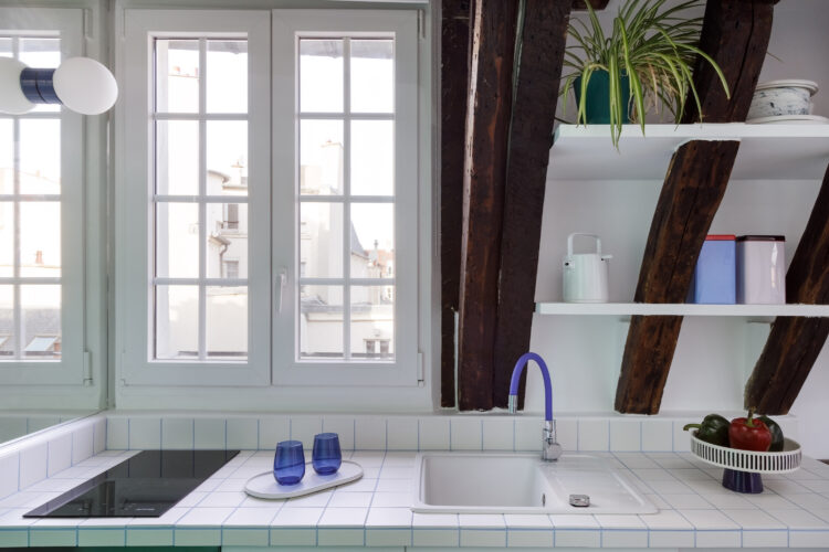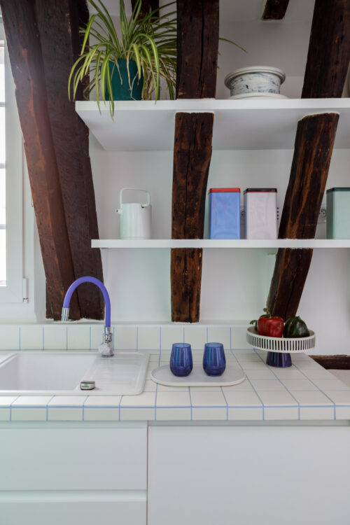 With its white cabinets, the kitchen looks rather unassuming… But on closer inspection, a host of original details stand out: the countertop is tiled and grouted in iceberg blue, matching the faucet.