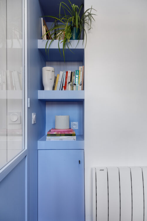 The designer, who was born in the South of France, naturally turned to an azure palette that transports us to the Mediterranean. Iceberg paint by Plum Living covers an entire wall. Blue Ü pouffe by noo.