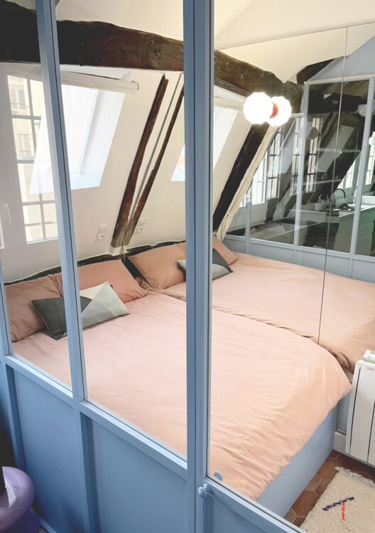 The elongated shape of this attic apartment comes into perspective from the bedroom. The existing tommettes floor tiles have been carefully preserved. They add an undeniable cachet to the apartment.