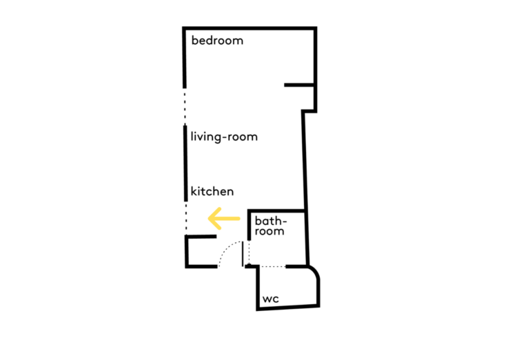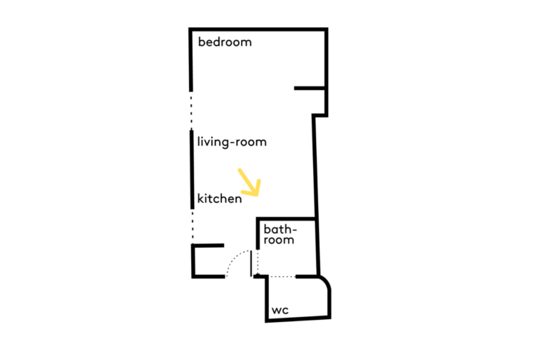 Despite the apartment’s small size, Ekhi Busquet gave it a real kitchen, which the presence of a mirror to the left of the window seems to make even more spacious.