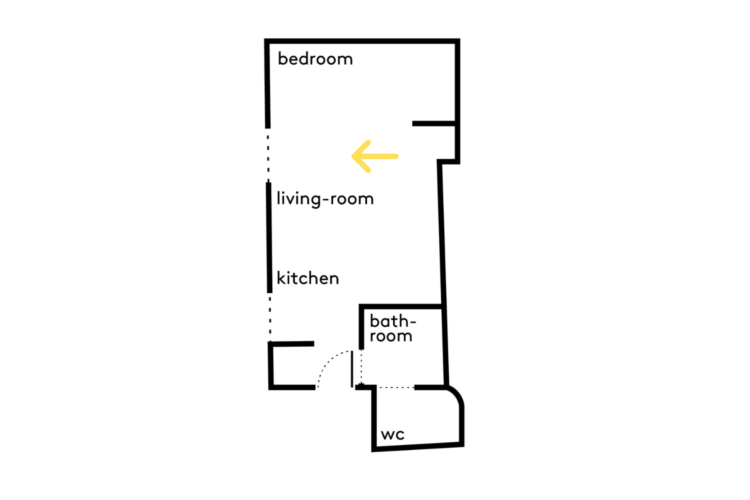 The bedroom, large enough for a 140 x 200 cm bed, is separated from the living room by a custom-made glass partition made of wooden slats. The back wall of the apartment is covered with mirrors that seem to double the bedroom’s surface area.