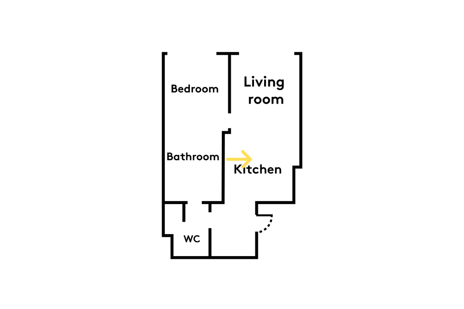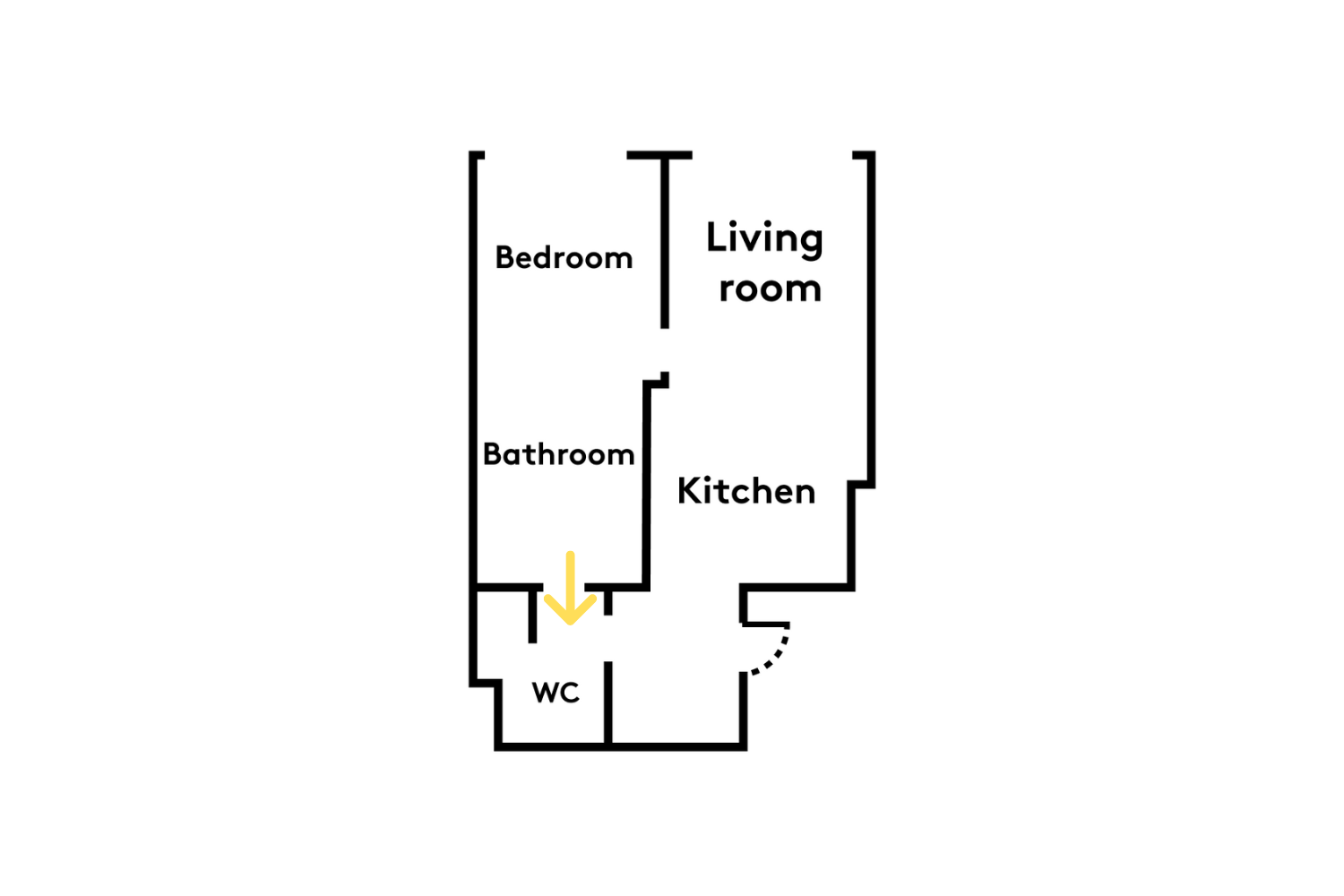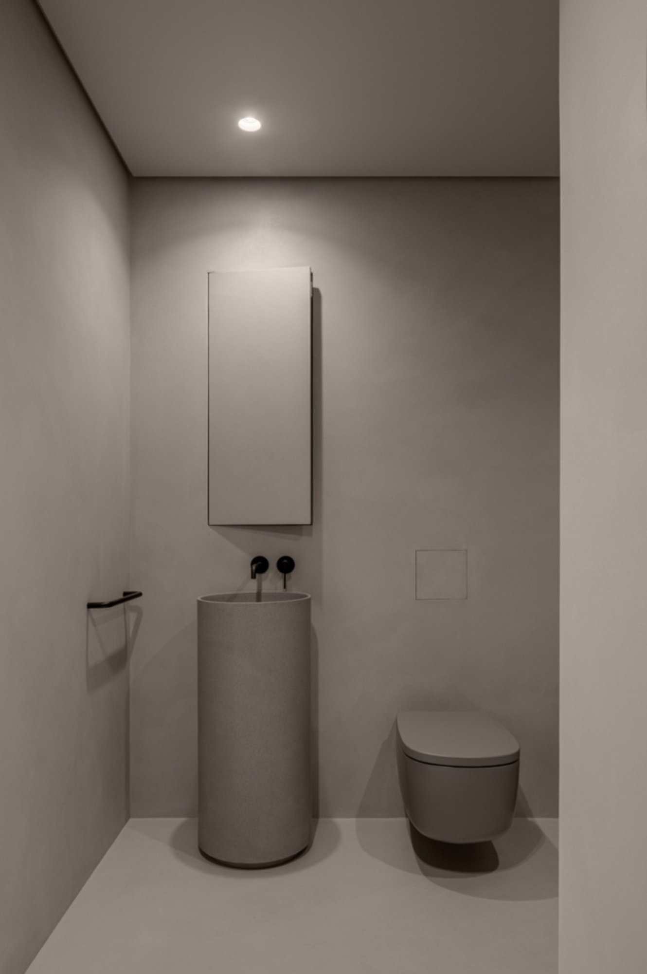 This leads to restroom, which is very evenly toned. The waxed concrete on the walls also covers the closet door, for a sleek effect.