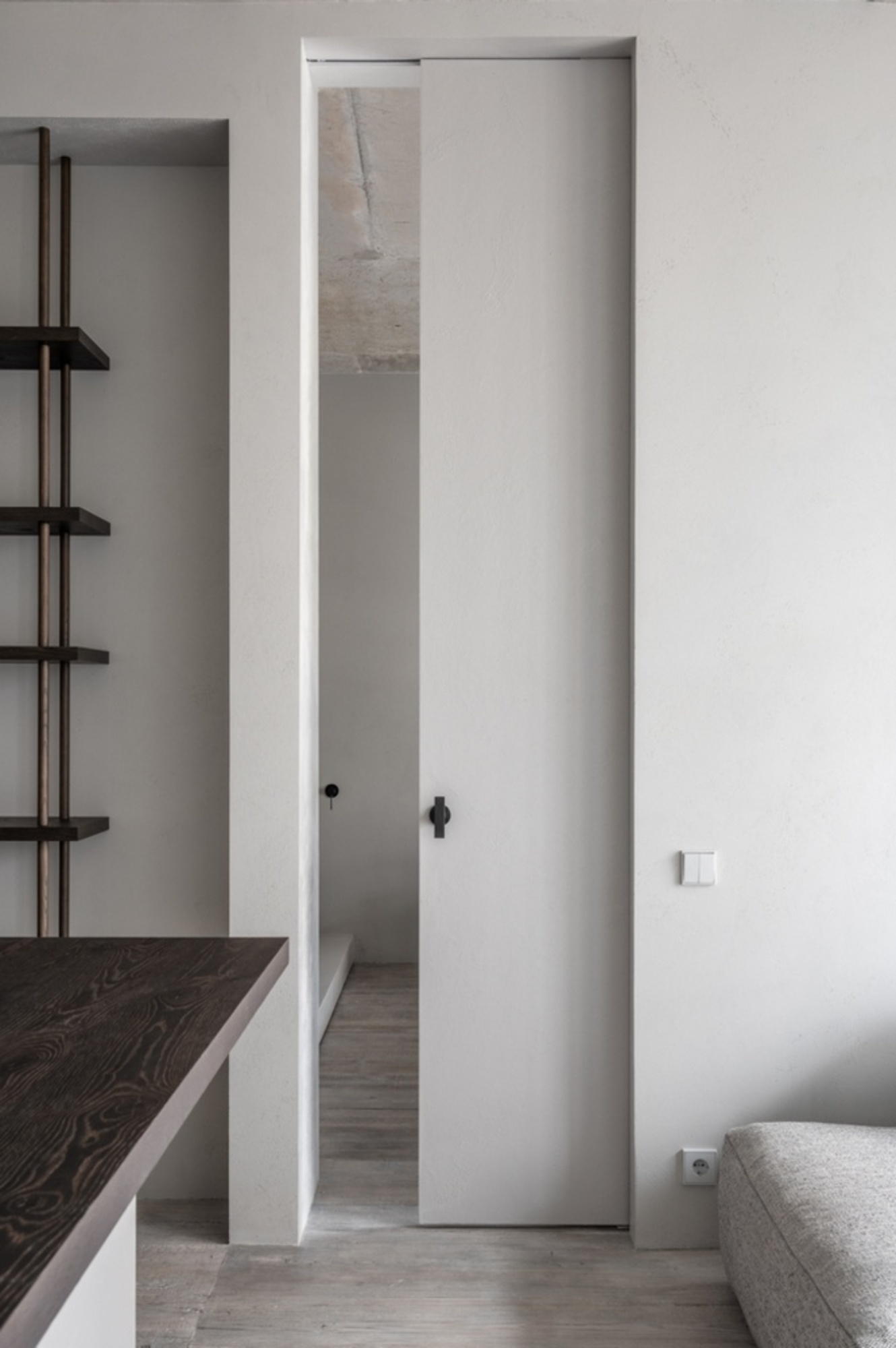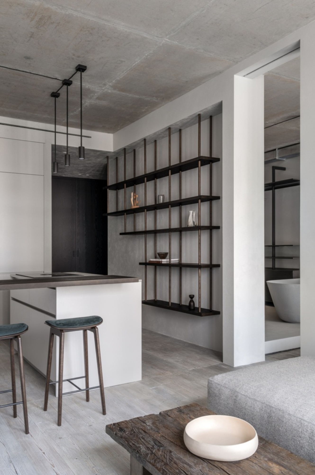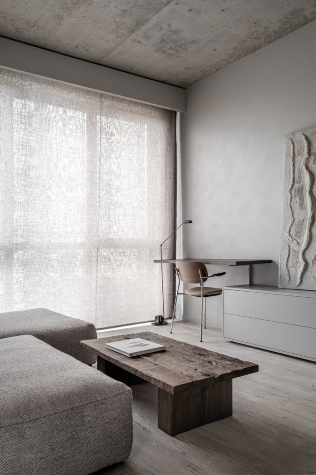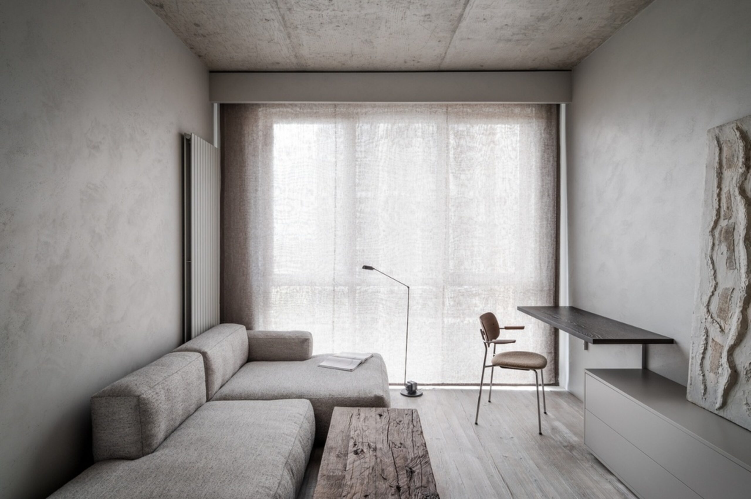 The mineral, luminous ambiance is very soothing. The apartment is designed as an artistic cocoon.