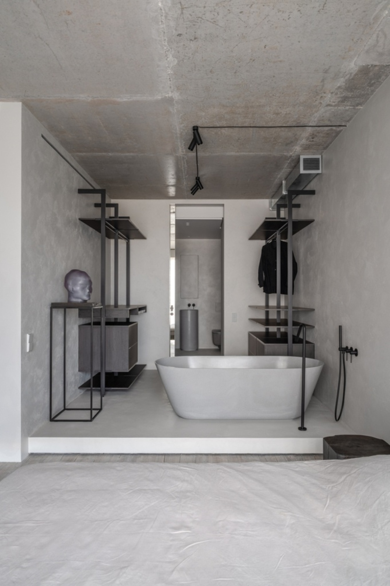 Surprisingly, the room is extended by a bathtub that perfectly blends into the decor. The difference in floor height dramatizes its presence.