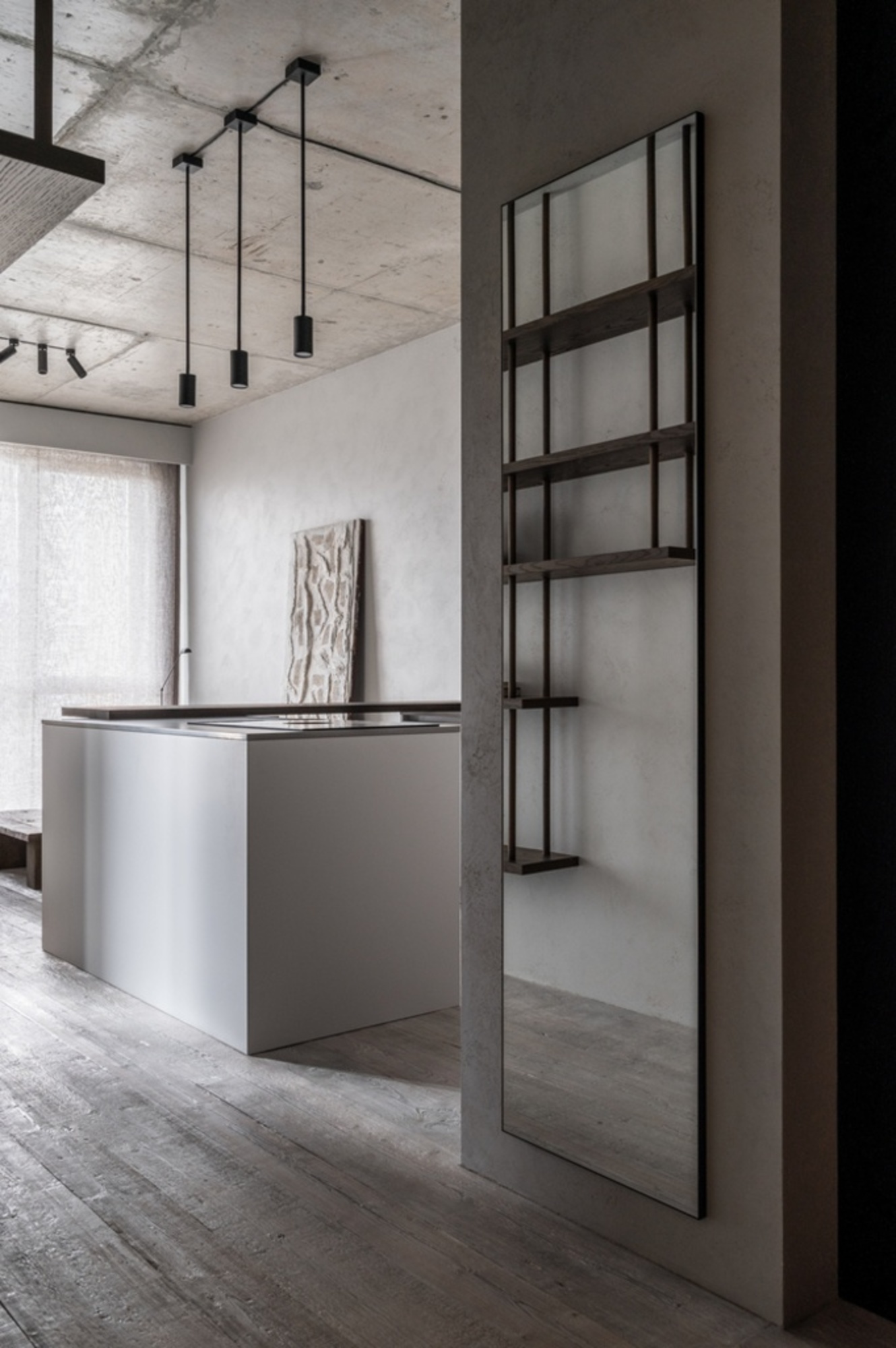 Right from the entrance, shades of gray create a soft, luminous atmosphere. The concrete ceiling is left exposed to preserve the overall coherence.