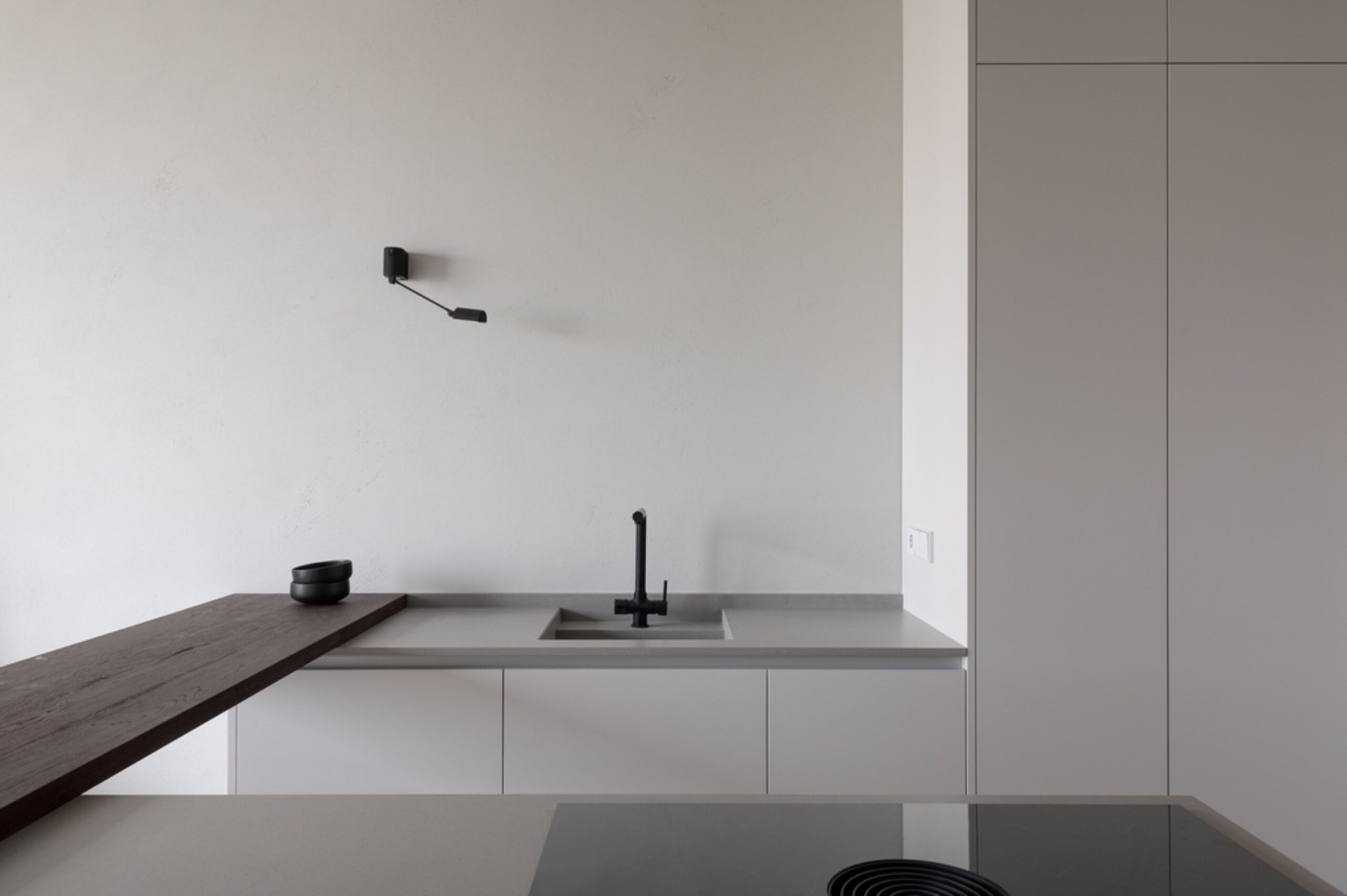 The kitchen is invisible: sleek yet ultra-functional, it doesn’t visually clutter the space. The extractor hood is thus integrated into the worktop.