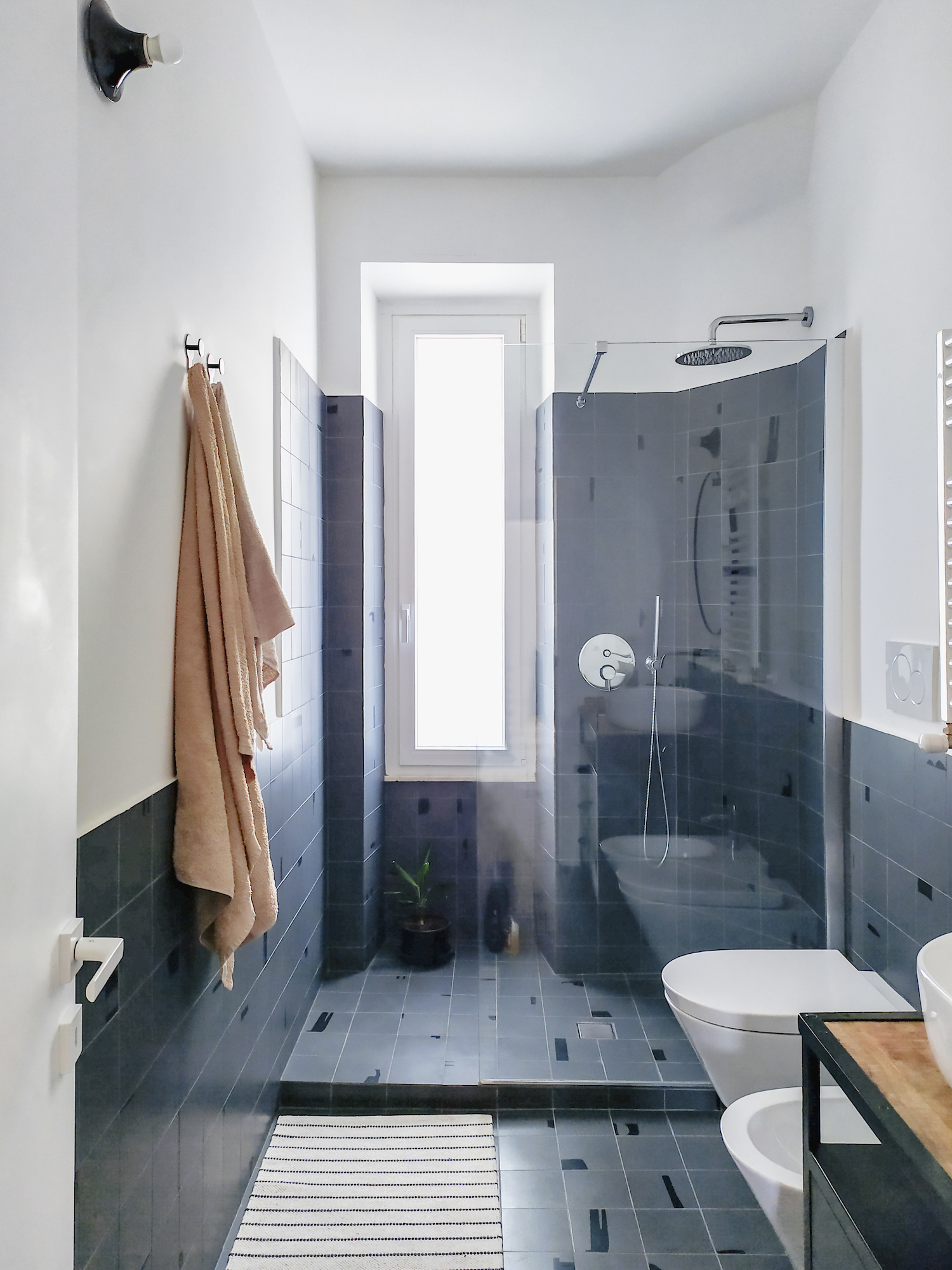 In the bathroom, more neutral tones. But the spirit remains the same: the tiles and their irregular pattern were set for a creative touch, and the large window for luminosity.