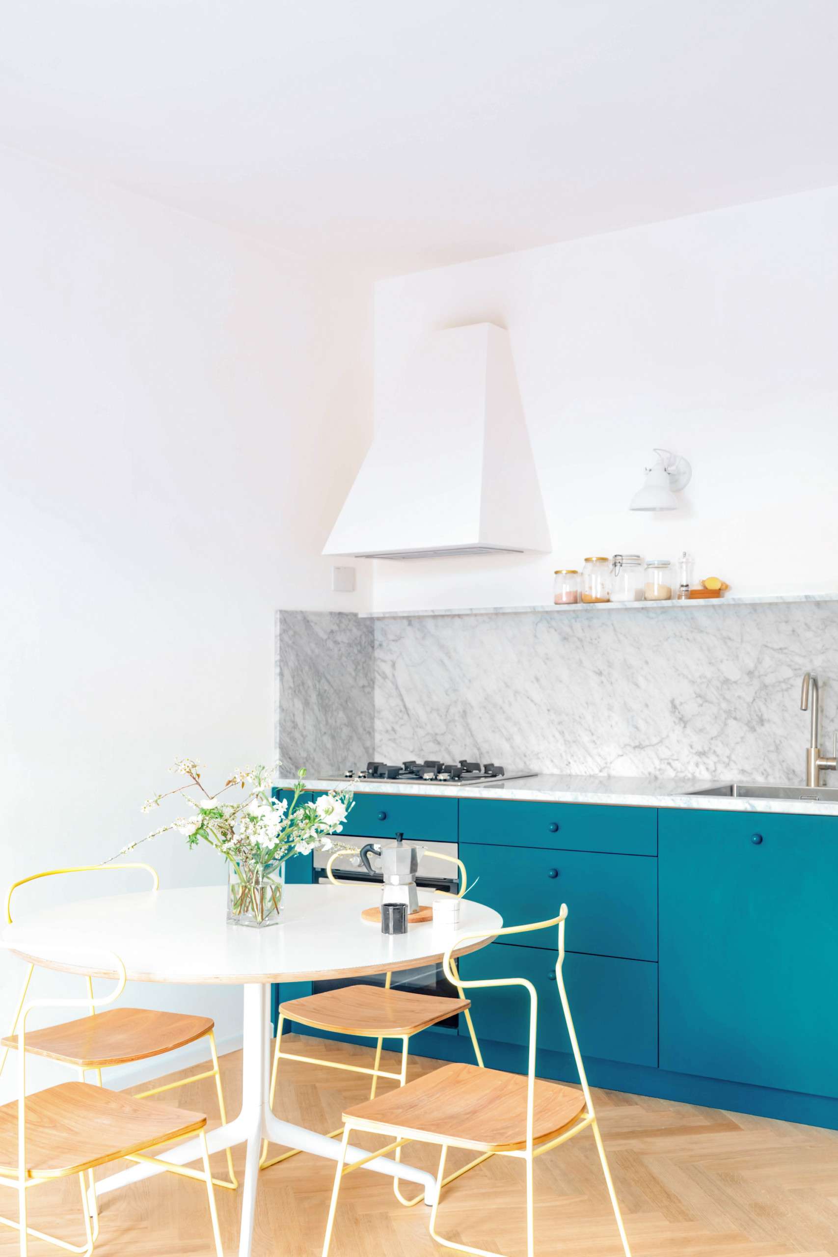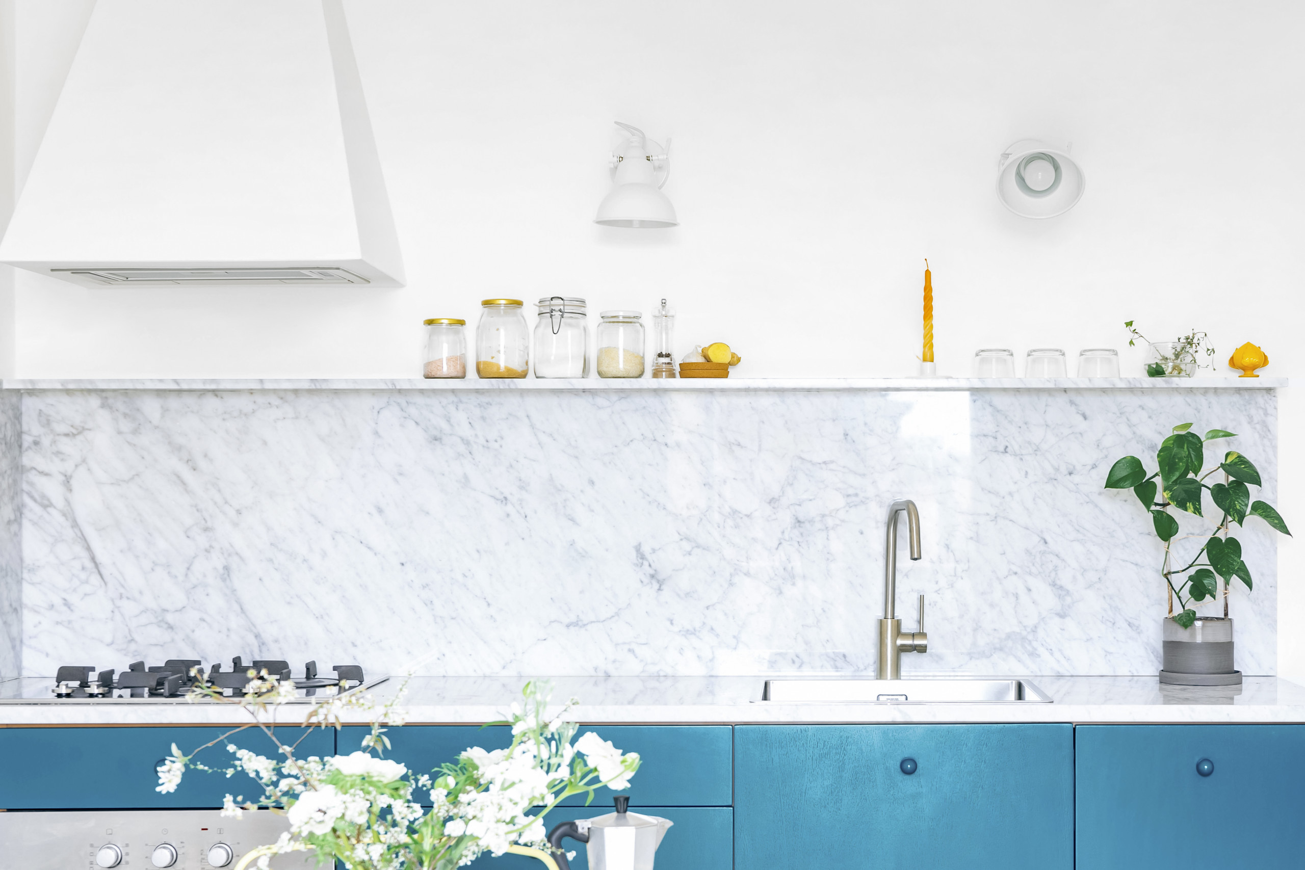 Backsplash and kitchen counter in light marble with discreet veining, to catch the light and not steal the show from the blue of the facades!