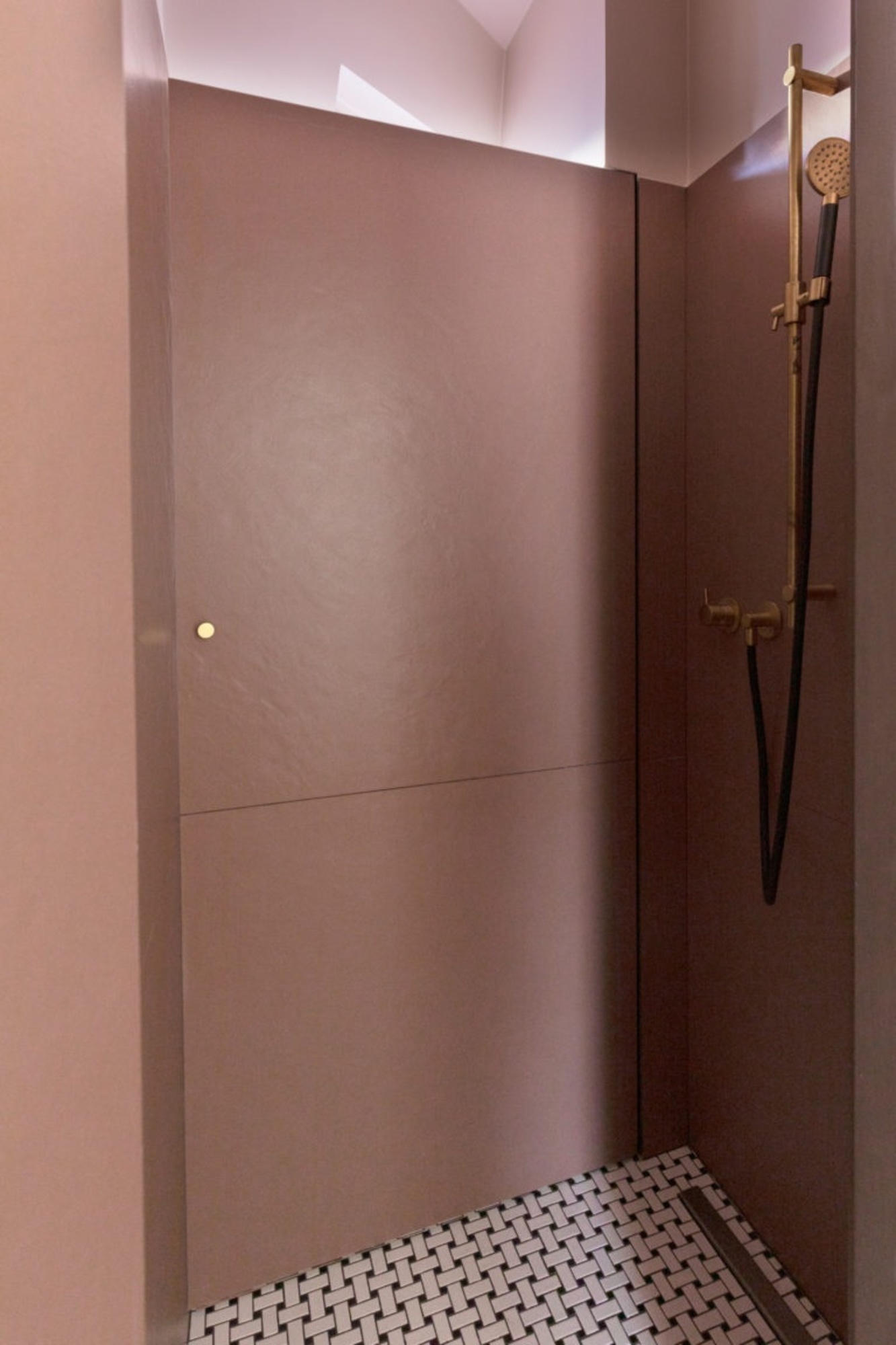 Brick red, powder pink and terracotta complete the color palette present in every room. A bridge headboard and trunk bed have been installed to free up floor space.