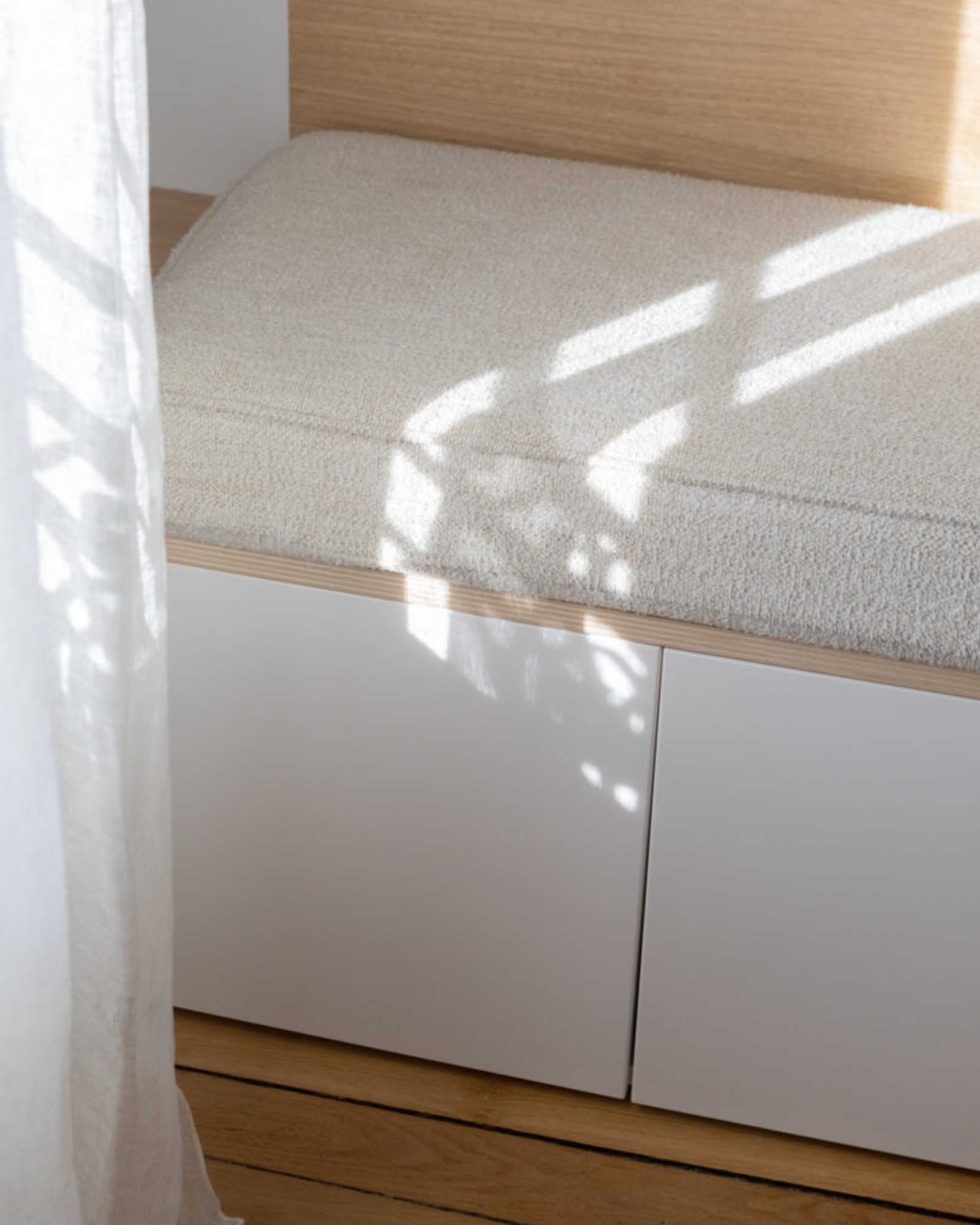 This idea of increasing storage capacity while providing an airy space is applied in every room. Result: in the living room, under-sloped spaces are optimized with cupboards and bookcases.