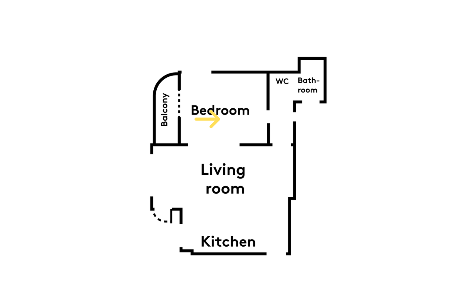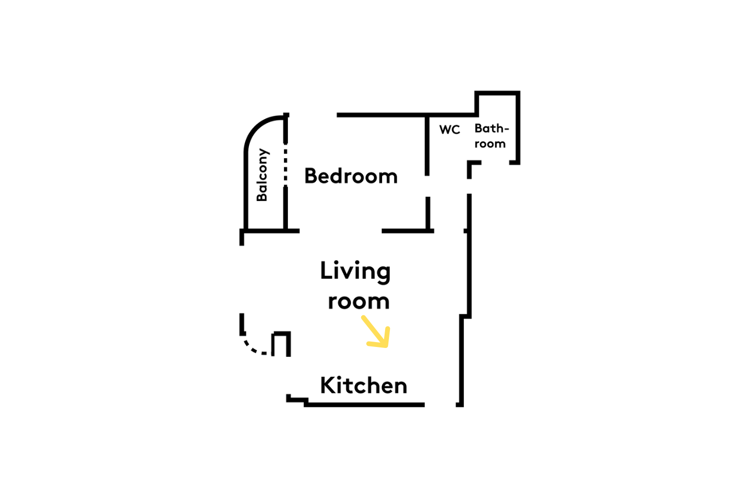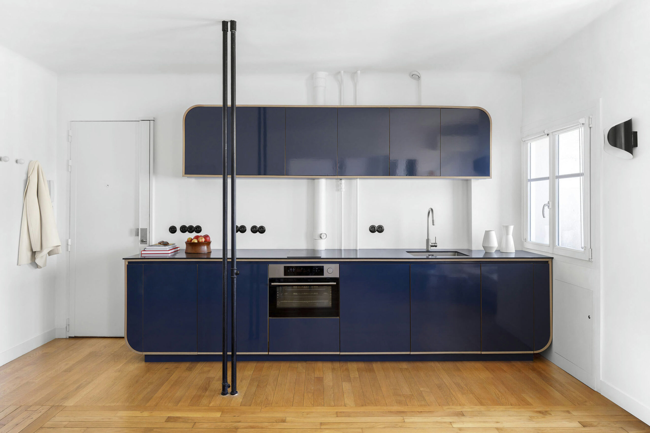 The kitchen is handled like a piece of furniture. Its rounded edges echo the shape of the apartment’s two balconies, softening the volume.