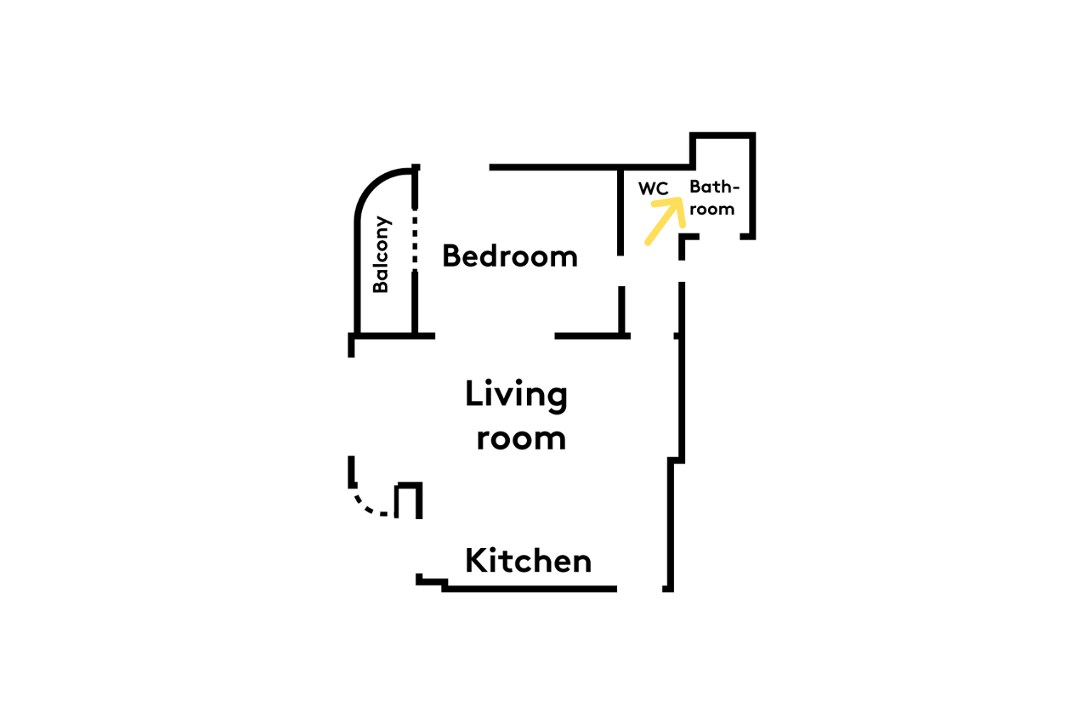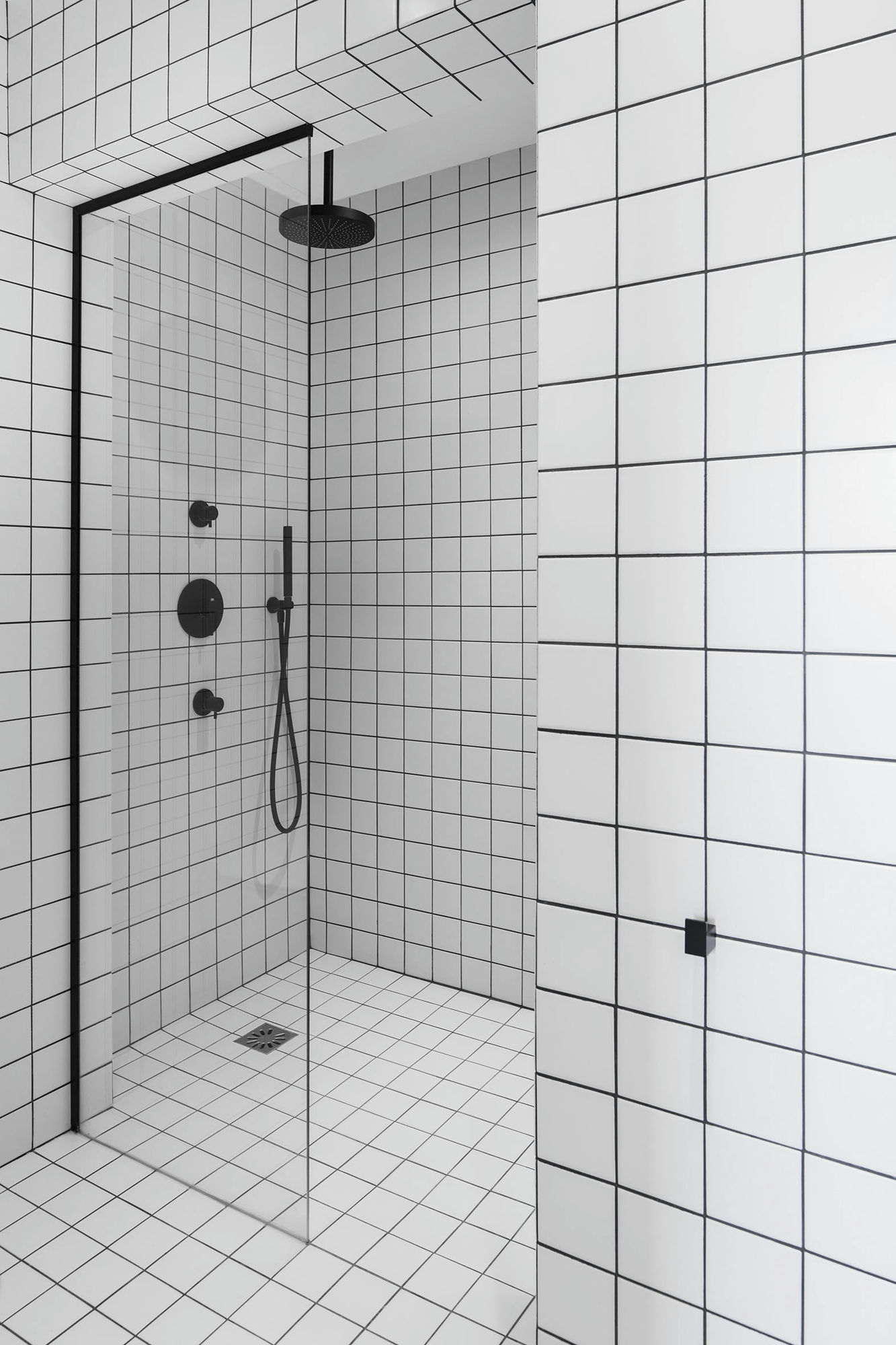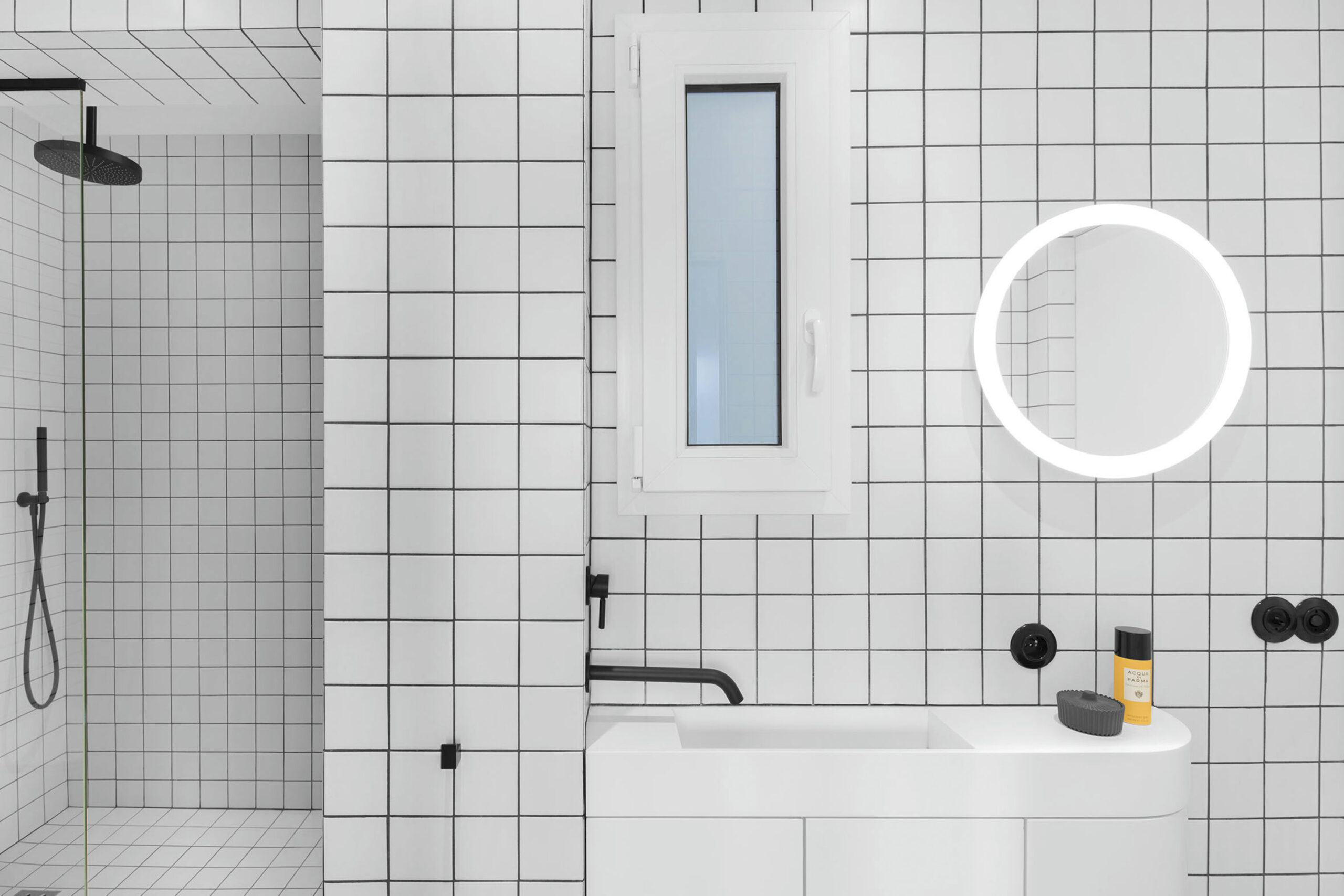 The bathroom has a very graphic feel, thanks to the use of black grout and the architectural curves of the building.