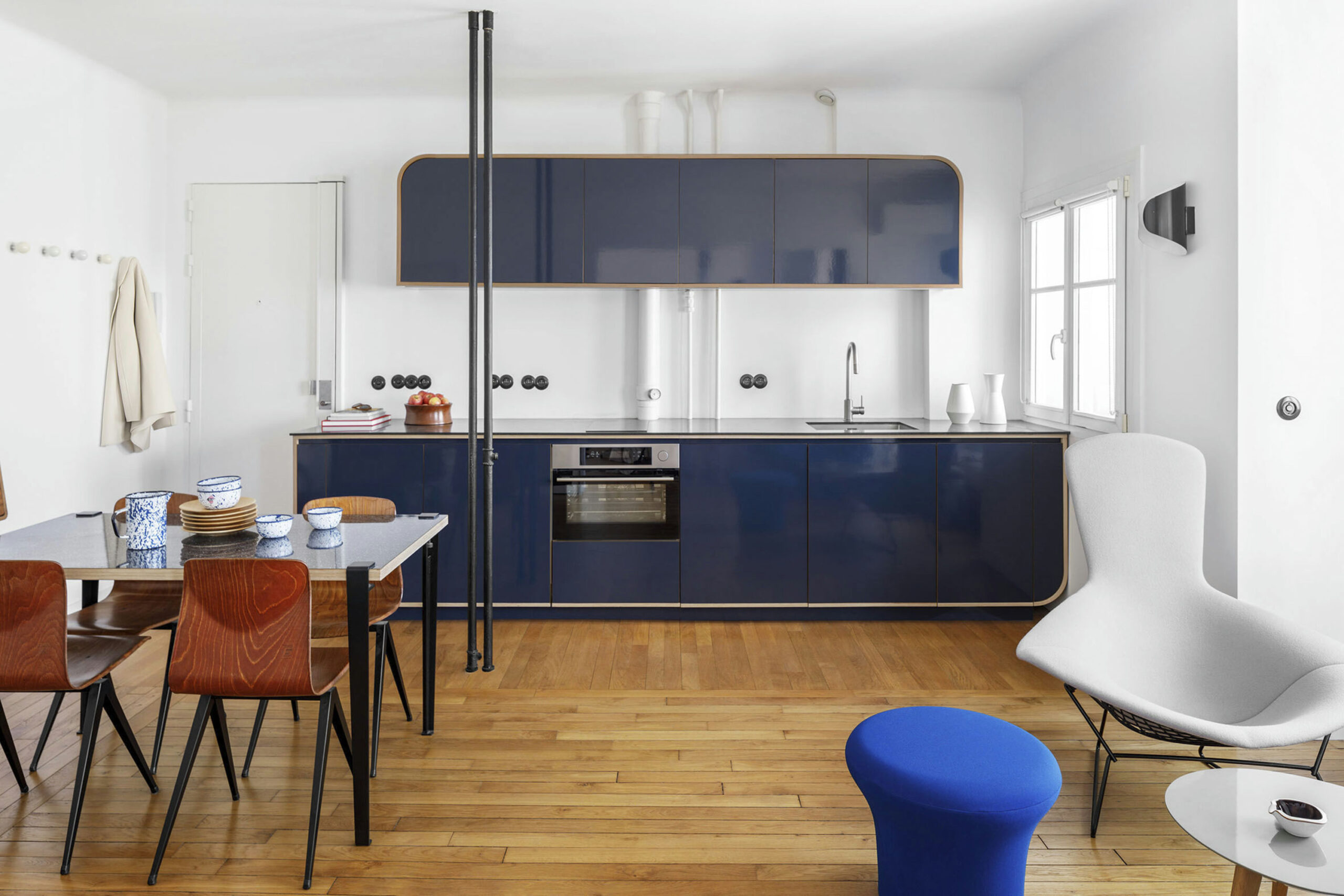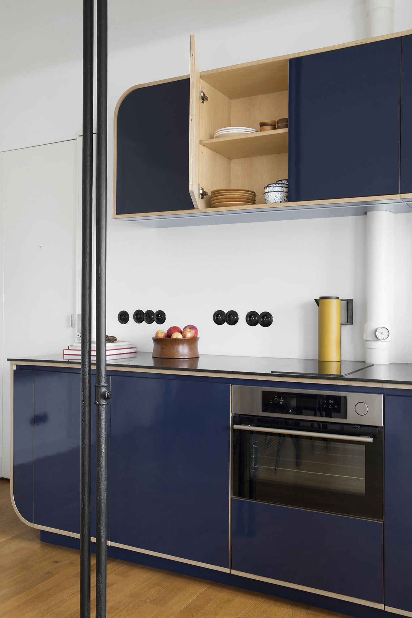 Its character is also expressed through the beautiful contrast between the midnight blue of the fronts and the raw MDF inside its cupboards.