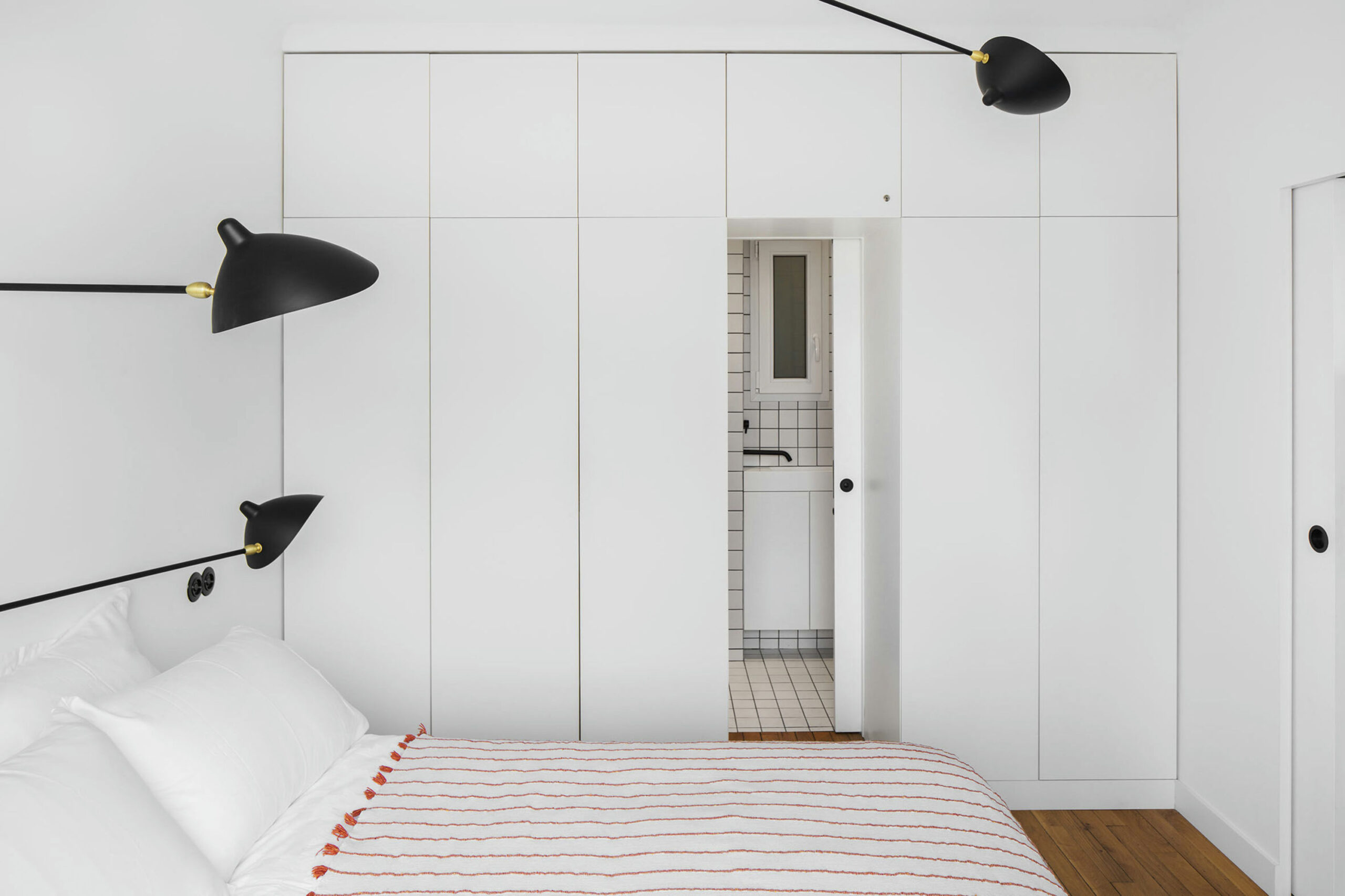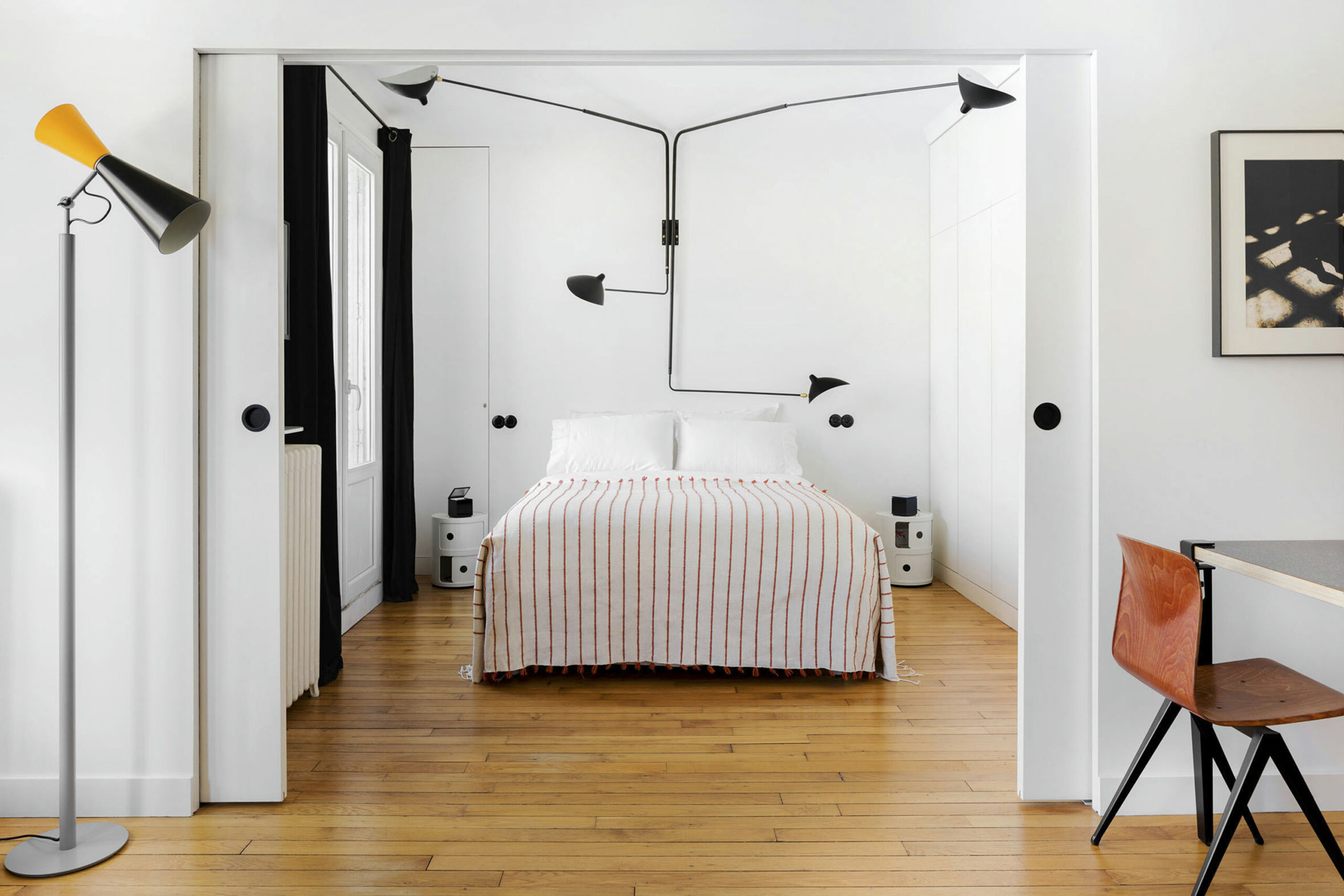 The layout focuses on the centerpiece, the bed. The headboard features an impressive 4-arm sconce by goldsmith-artist Serge Mouille (1922-1988).