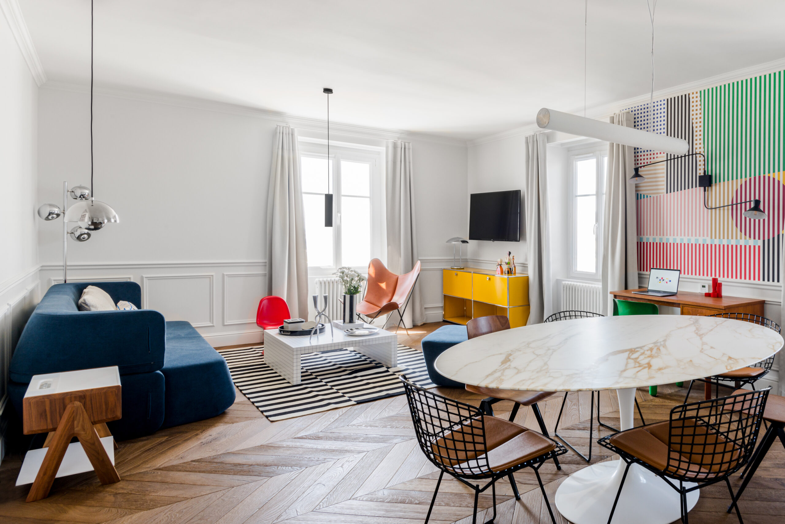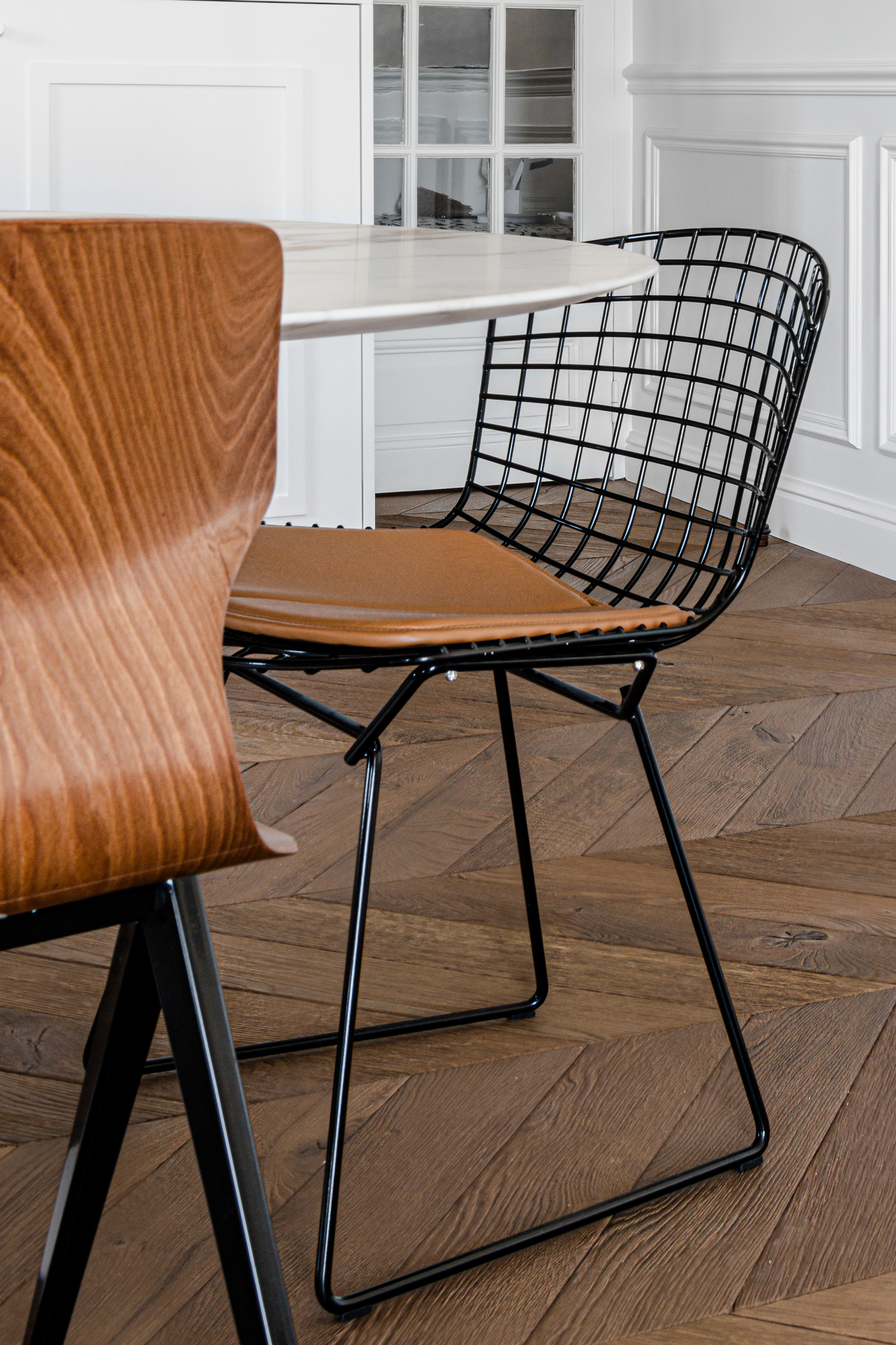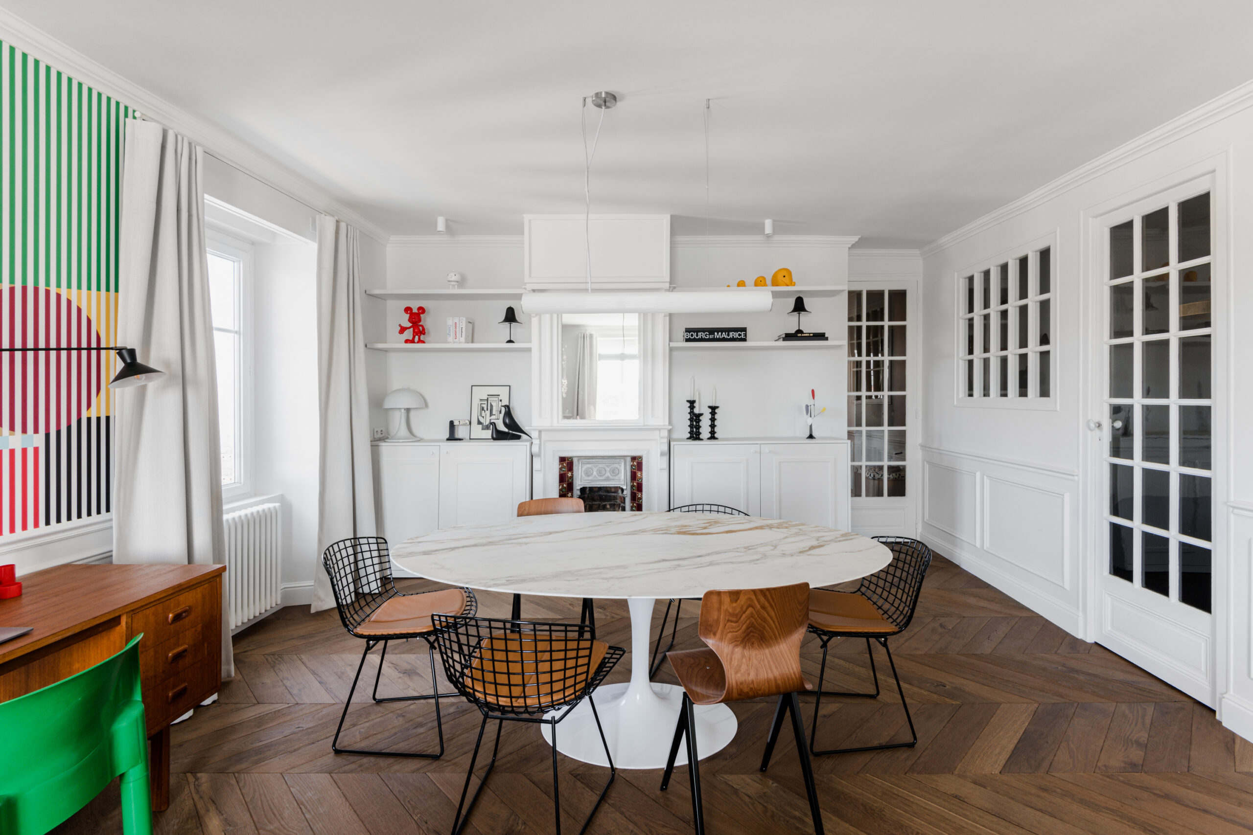 The dining area features more neutral tones and noble materials. Like the marble top of the Knoll table combined with vintage chairs from Cartel de Belleville.