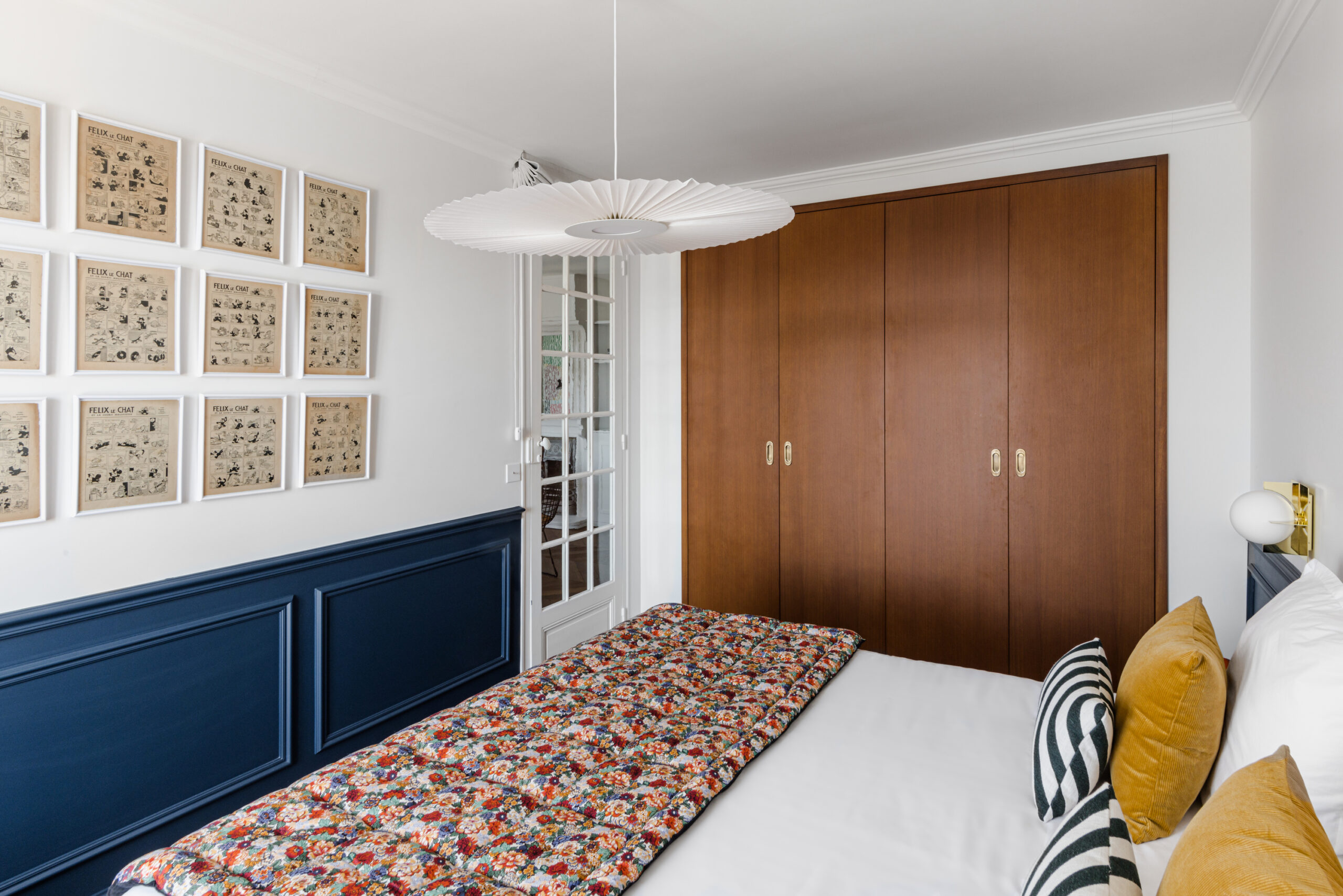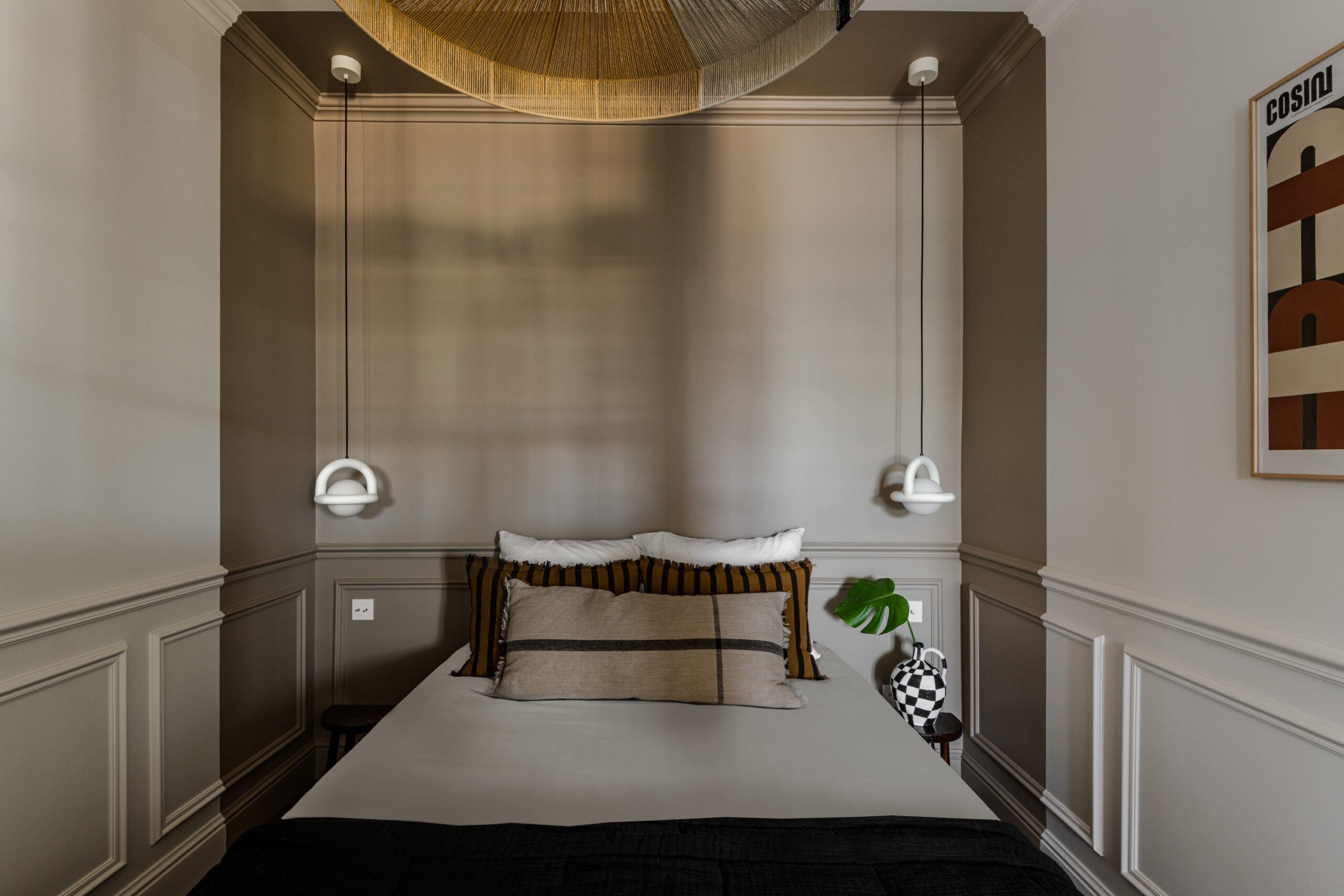 The secondary bedroom was designed in light and warm tones to compensate the fact that it is smaller and windowless. A glass door was created to bring in diffused light to illuminate the headboard, which was repainted in a soft, mineral beige.