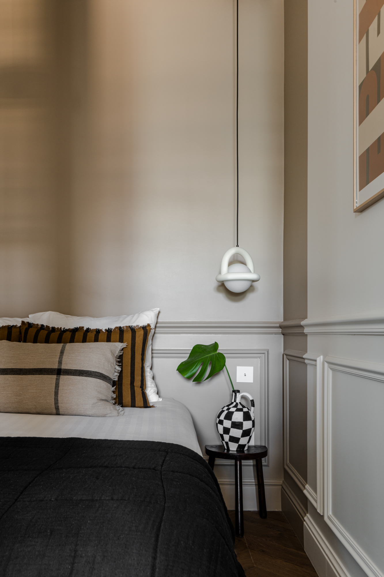 Delicately suspended ceiling lights maintain the soft atmosphere ideal for this bedroom.