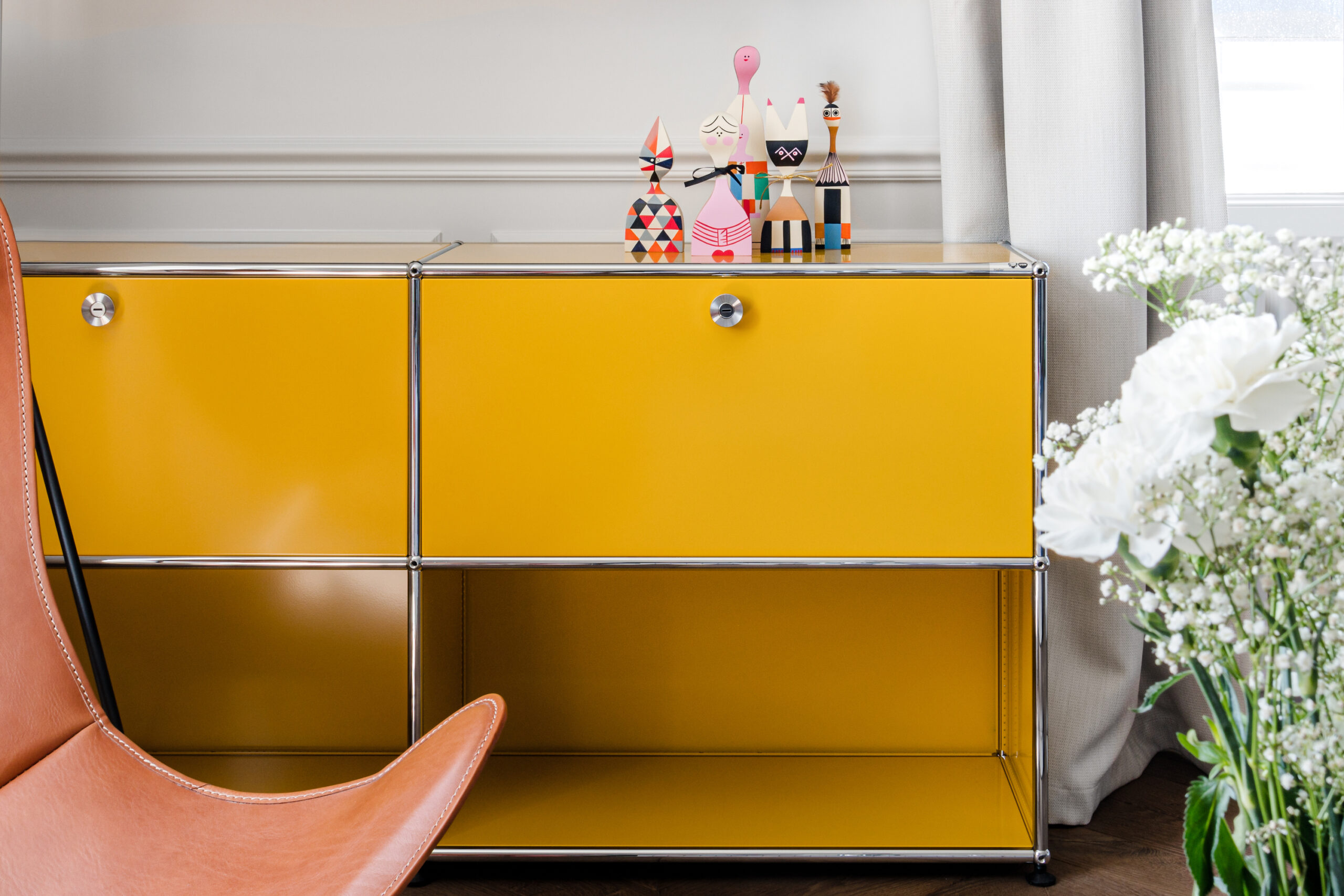 In the living room, iconic pieces such as the yellow USM sideboard and the leather Butterfly armchair sit alongside vintage furniture…